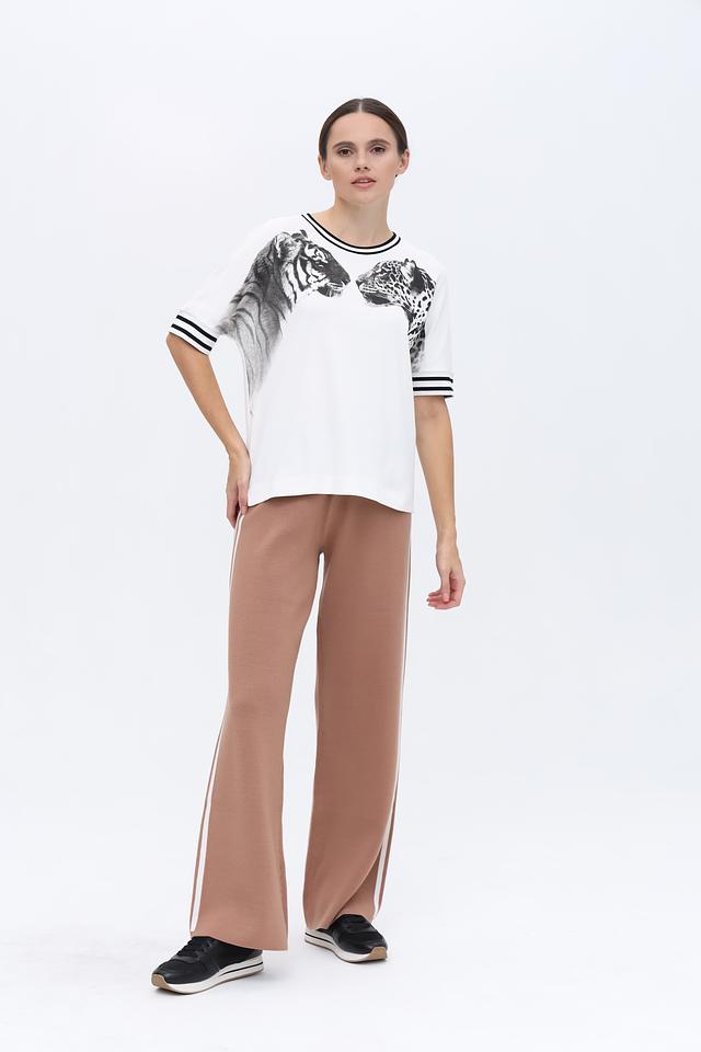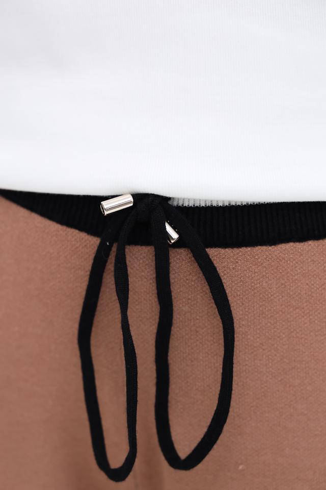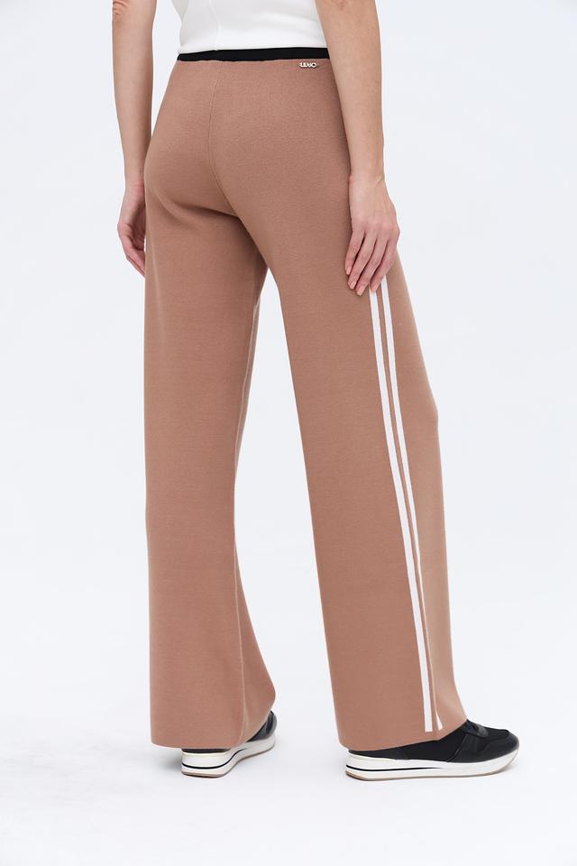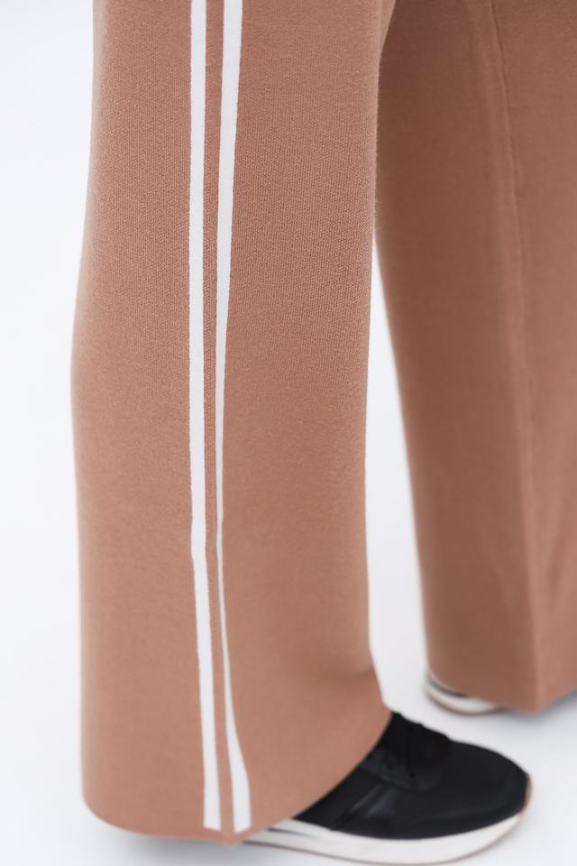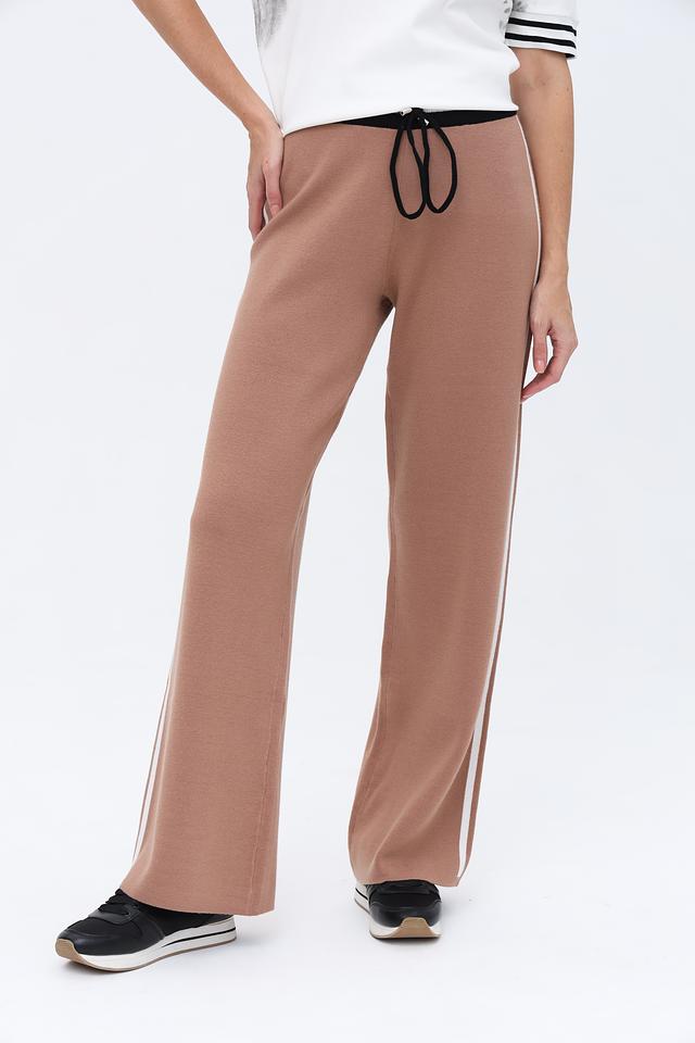 Брюки имеют клёш от бедра, что придает им элегантный и женственный вид. Боковые полоски добавляют динамики и спортивного шика. Удобный пояс на резинке с черным шнурком обеспечивает комфортную посадку по фигуре.