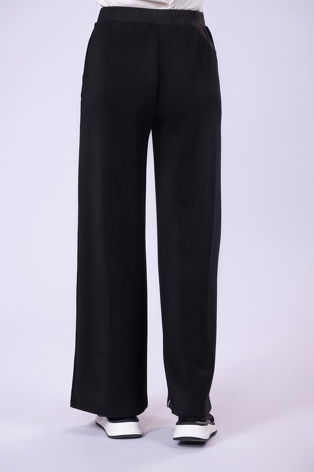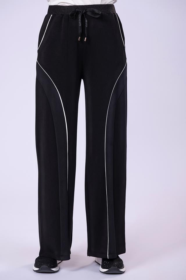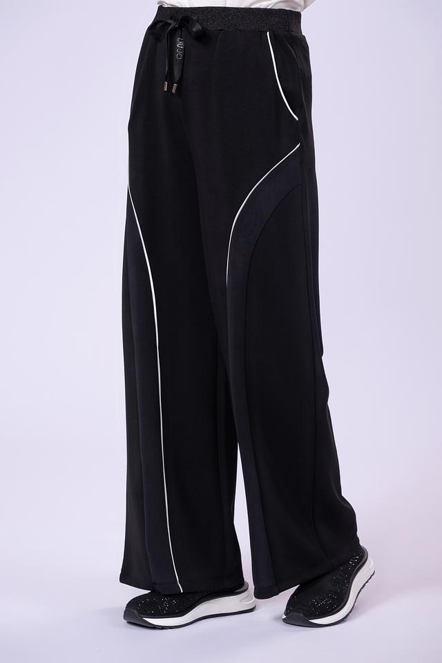 Брюки имеют прямой крой и широкие штанины, обеспечивающие свободу движений. Эластичный пояс с кулиской гарантирует комфортную посадку по фигуре. По бокам брюк расположены контрастные белые полосы, добавляющие динамичности и спортивного стиля.