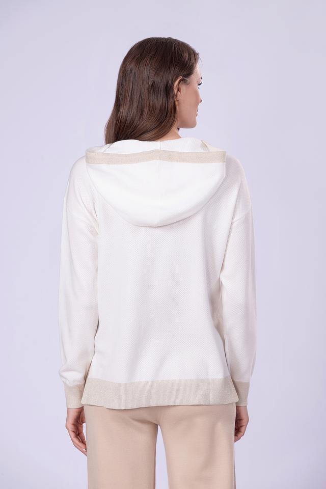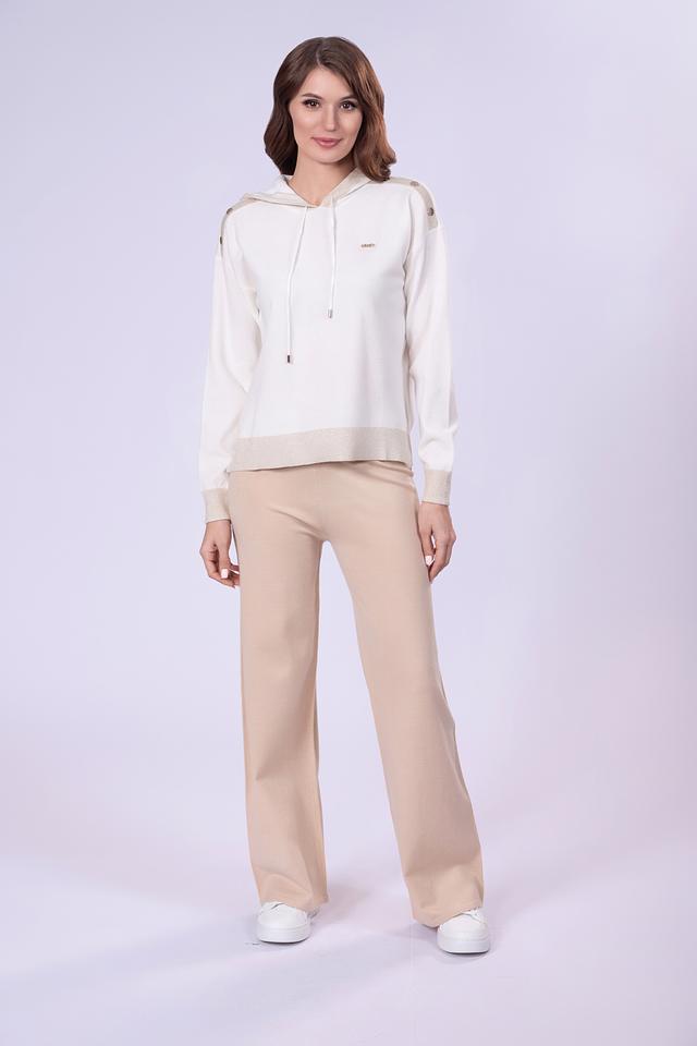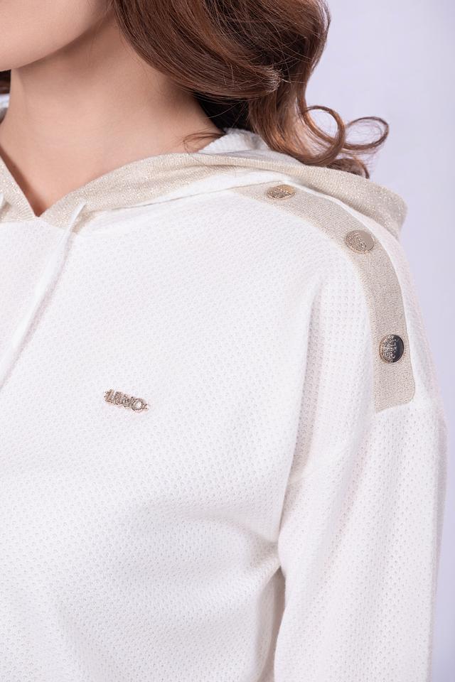 Женский джемпер Liu-Jo кремового цвета с капюшоном и декоративными пуговицами на плечах. Модель выполнена из мягкого трикотажа с текстурной вязкой и дополнена шнурками на капюшоне. Состав: полиакрил 52%, полиэстер 28%, полиамид 20%