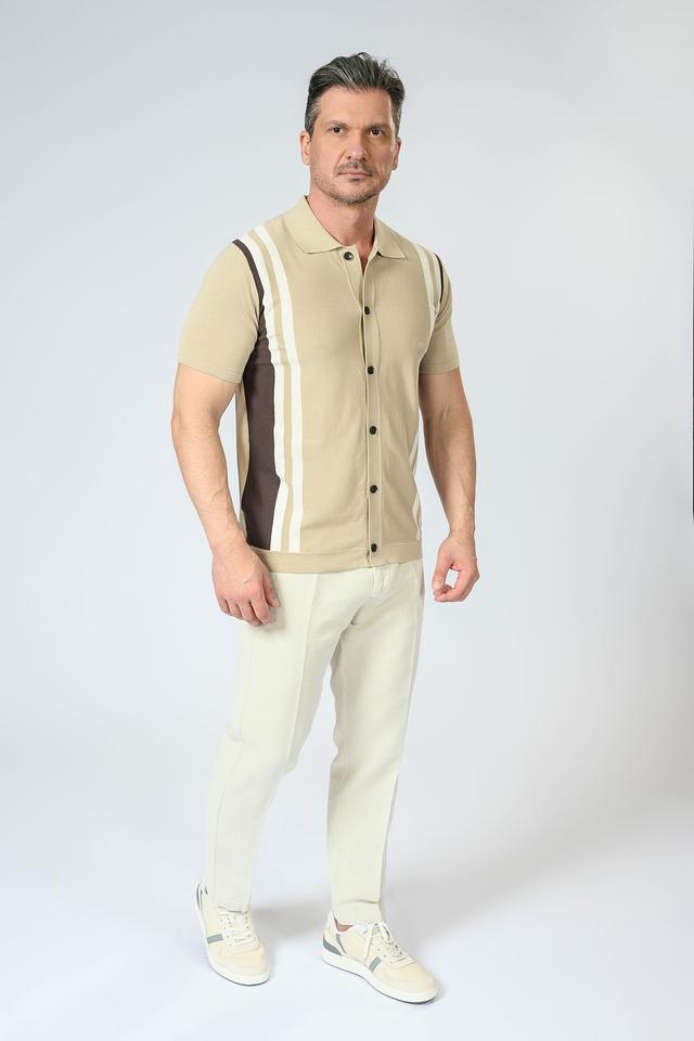 Мужской джемпер Liu-Jo бежевого цвета с коротким рукавом и вертикальными полосами. Модель выполнена из 100% хлопка, имеет воротник-поло и застежку на пуговицы. Состав: хлопок 100%