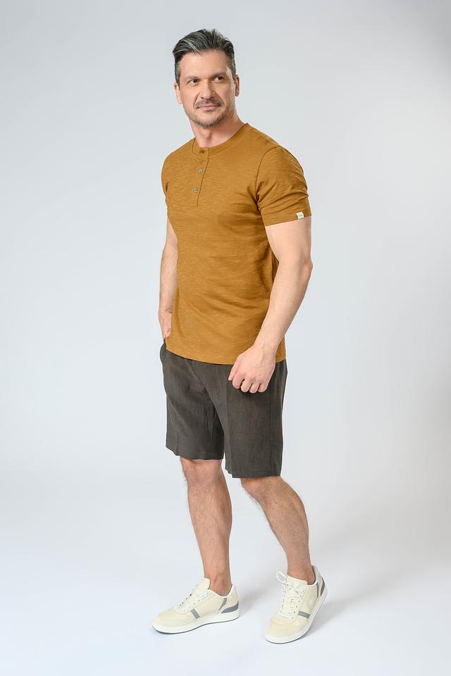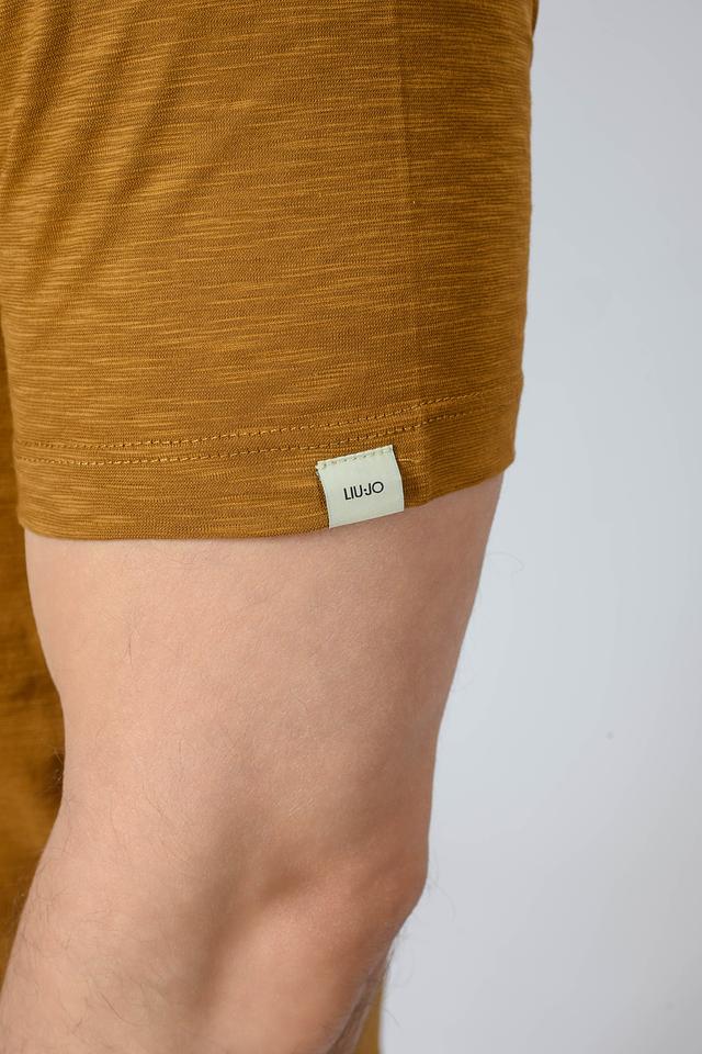 Мужская футболка Liu-Jo горчичного цвета с короткий рукавом и планкой на пуговицах. Изготовлена из 100% хлопка, обеспечивающего комфорт и воздухопроницаемость. Отличный выбор для повседневного образа. Состав: хлопок 100%