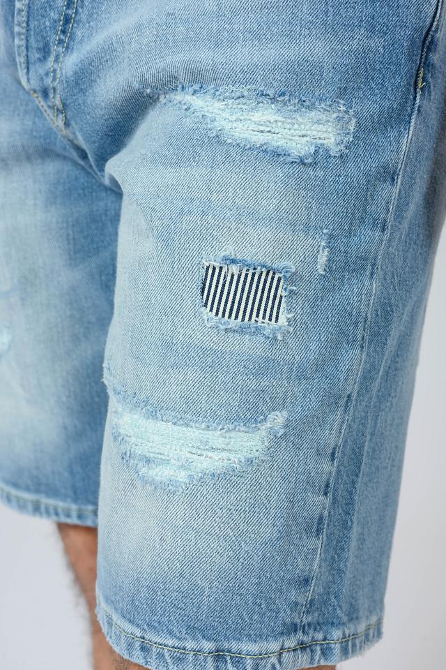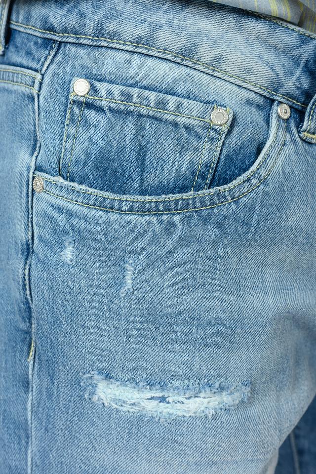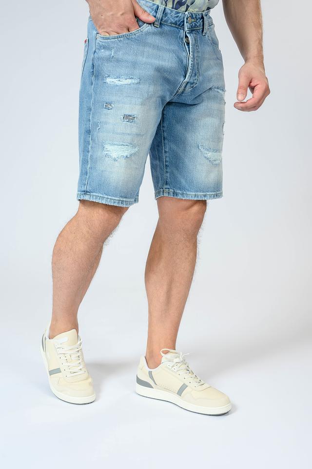 Шорты имеют классический голубой цвет с эффектом потертости, который придает им непринужденный и современный вид. Декоративные рваные элементы добавляют образу дерзости и индивидуальности.