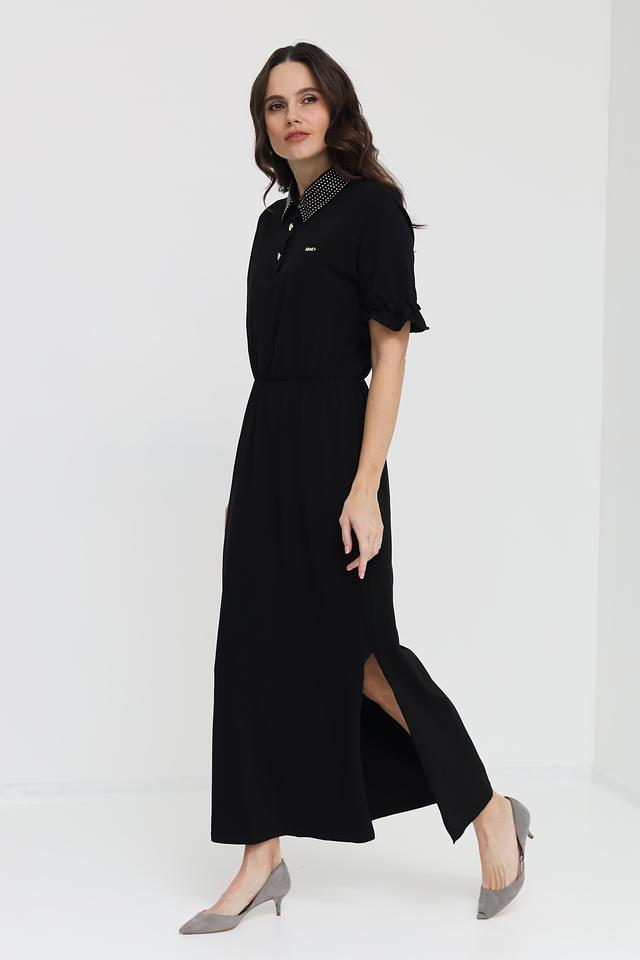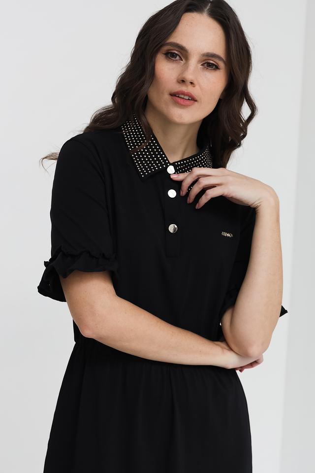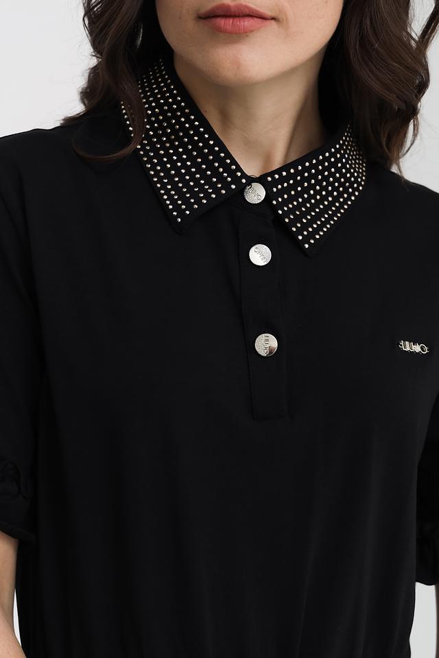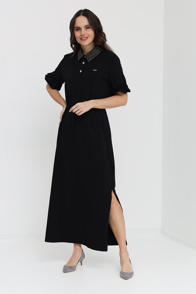 Чёрное платье Liu-Jo длиной миди с оригинальным воротником, украшенным стразами. Модель выполнена из мягкого хлопка с добавлением эластана, обеспечивающего комфортную посадку по фигуре. Состав: хлопок 95%, эластан 5%