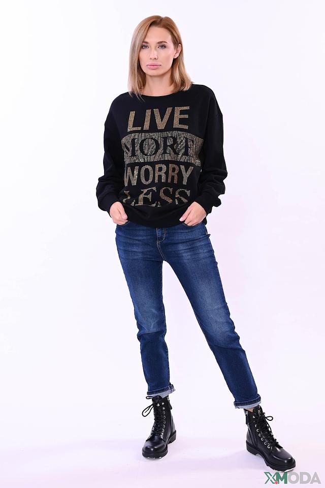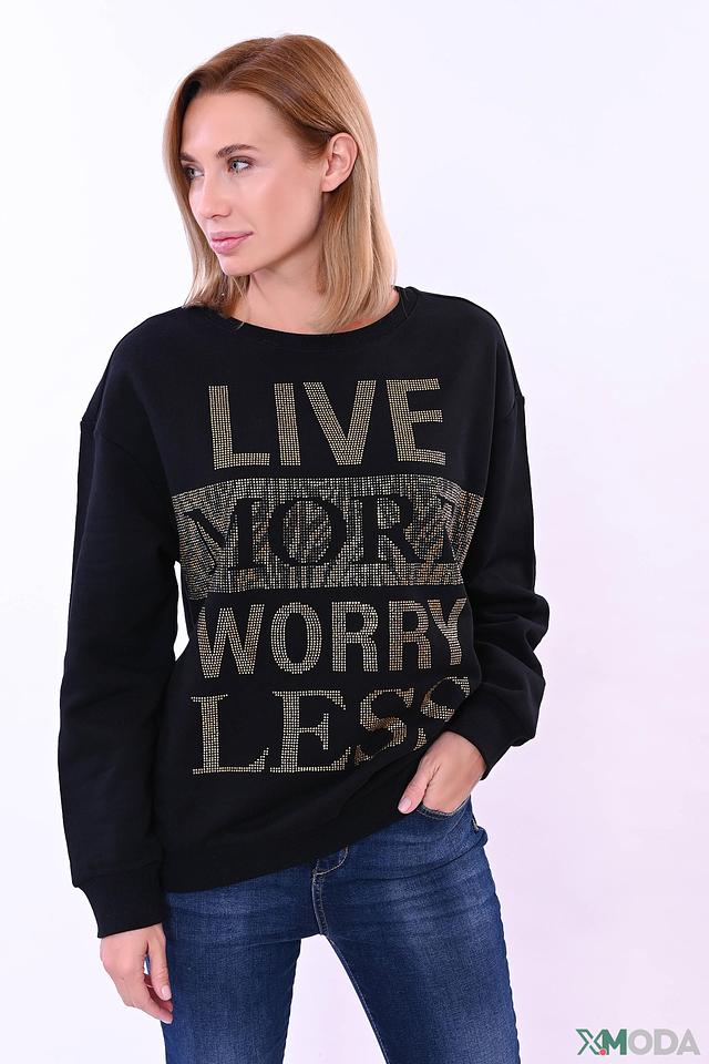 Основным акцентом модели является яркая надпись "LIVE MORE WORRY LESS", выполненная с использованием множества сверкающих страз. Этот декор придает джемперу особый шарм и привлекает внимание.