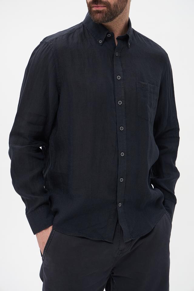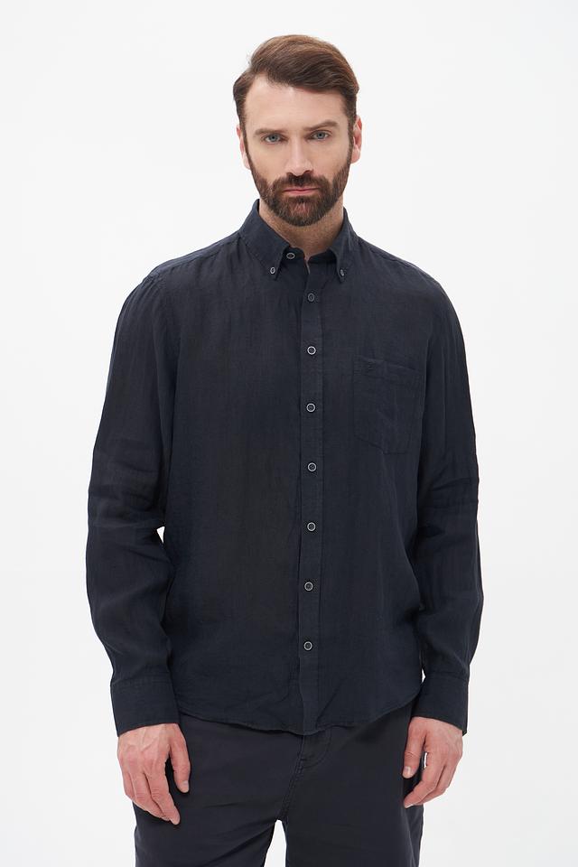 Темно-синий цвет рубашки делает ее универсальной и легко сочетаемой с различными элементами гардероба – от брюк и джинсов до шорт. Эта рубашка станет прекрасным дополнением к вашему повседневному или casual стилю. Льняная ткань придает рубашке слегка мятый вид, что подчеркивает ее натуральность и непринужденность.