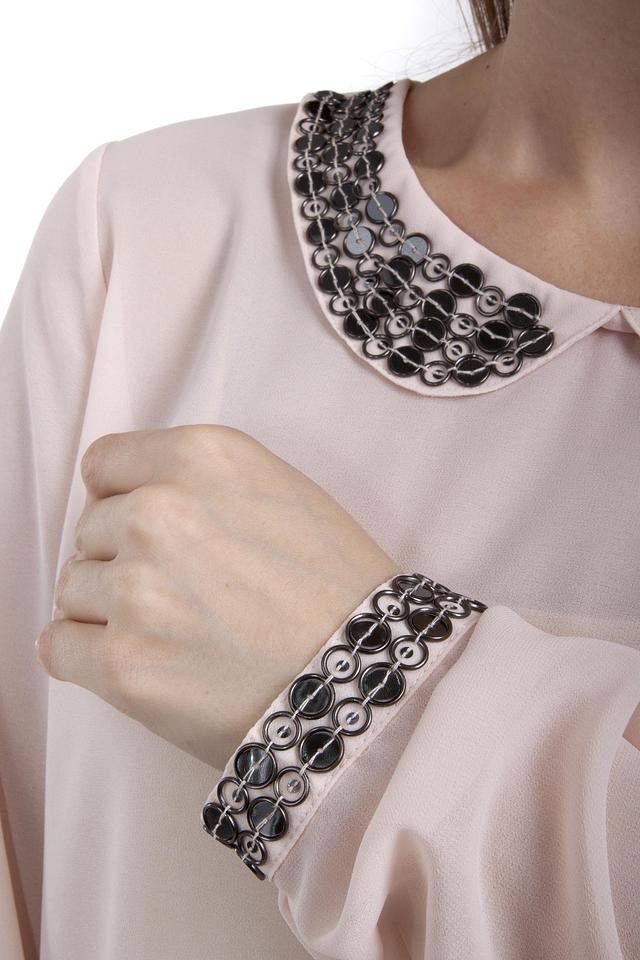 - Декоративные элементы: Манжеты также декорированы идентичными объемными звеньями, гармонично дополняя дизайн воротника. Этот продуманный акцент создает завершенный и элегантный образ.