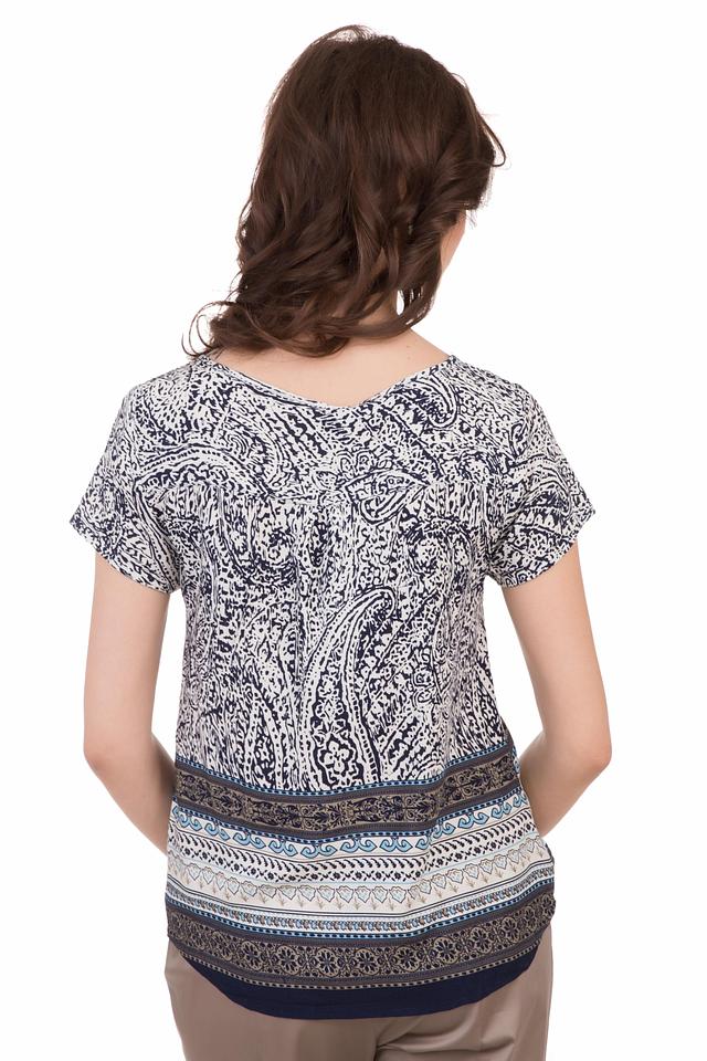 Модель имеет короткие рукава и округлый вырез горловины, что обеспечивает свободу движений и комфорт в носке. Блуза выполнена из полиэстера с добавлением эластана, что делает ее приятной к телу, легкой в уходе и устойчивой к сминанию.