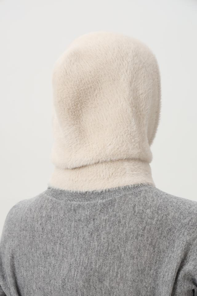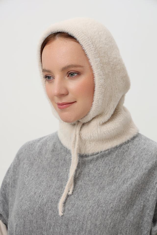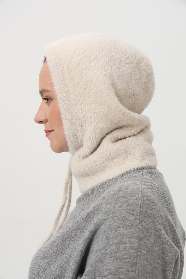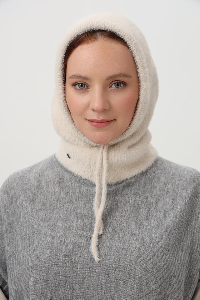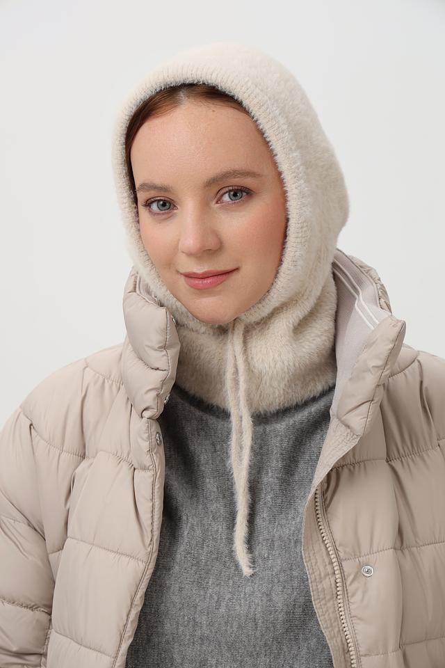 Нежный кремовый оттенок шапки легко сочетается с различными стилями одежды, добавляя образу мягкости и утонченности. Особенностью модели является удобный капюшон, который защитит от ветра и снега, а также декоративная шнуровка для регулировки посадки.