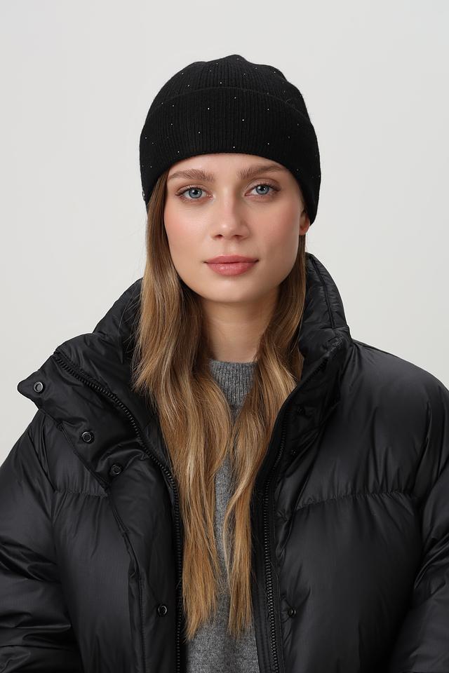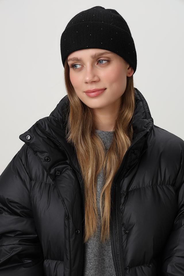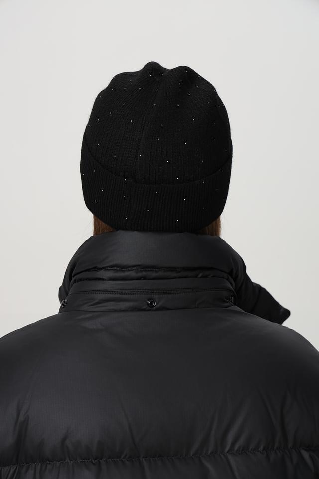 Особый шарм этой шапке придаёт декор в виде мелких страз, аккуратно расположенных по всей поверхности. Также на шапке присутствует небольшой металлический логотип бренда. Шапка плотно прилегает к голове, надёжно защищая от холода и ветра.