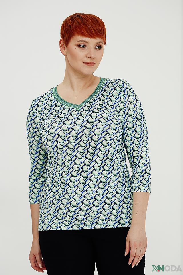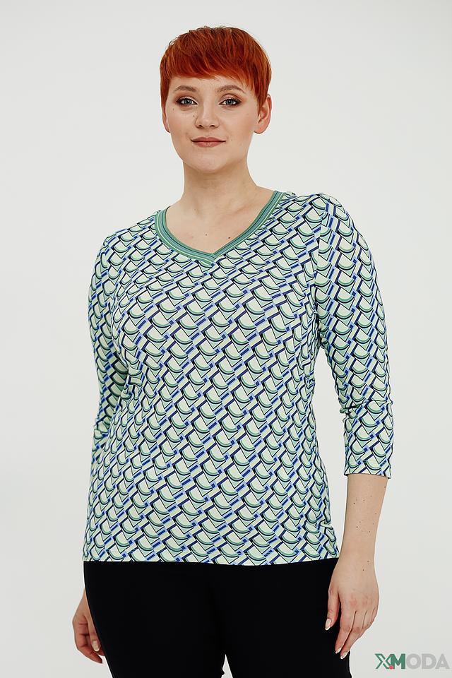 Лонгслив имеет приталенный силуэт и V-образный вырез горловины, что делает его универсальным для создания различных образов. Оригинальный геометрический принт в бирюзовых, белых и синих тонах добавляет изделию изысканности и неповторимости.