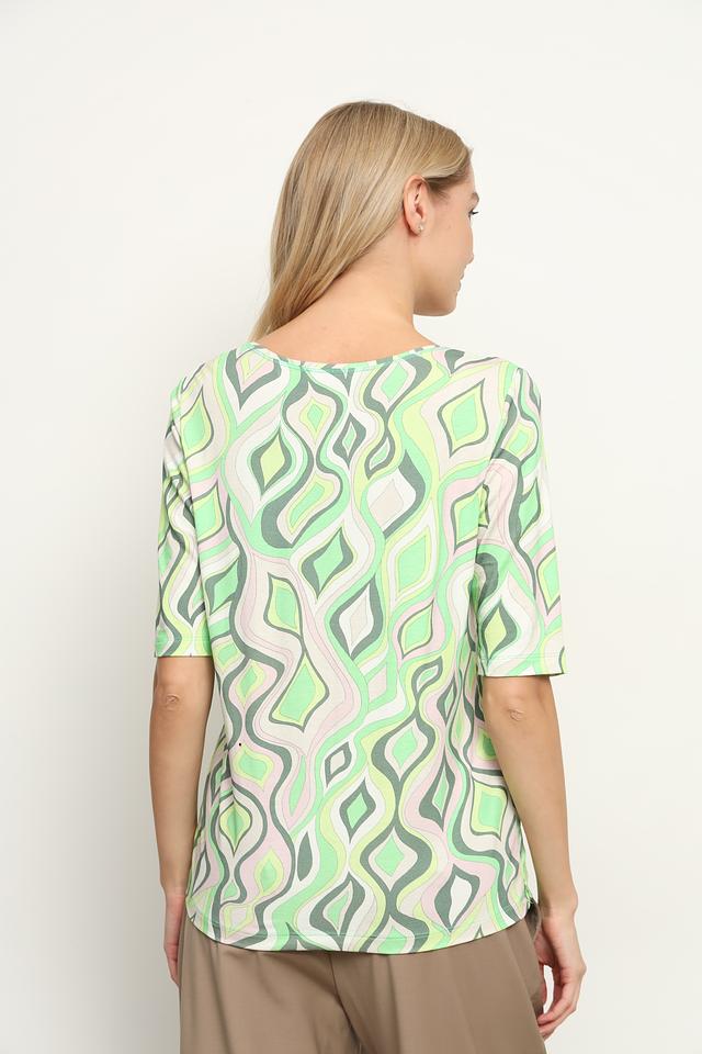 Лонгслив имеет короткий рукав и округлый вырез горловины. Главная особенность модели – яркий геометрический принт, выполненный в оттенках зеленого, лайма и серого. Такой рисунок добавит вашему образу оригинальности и индивидуальности.