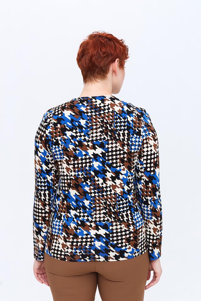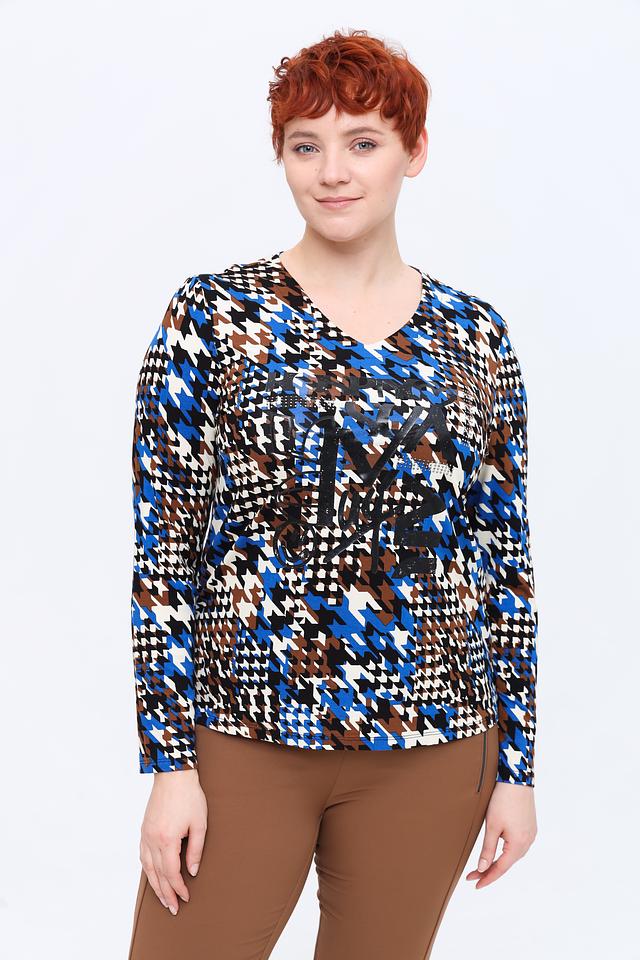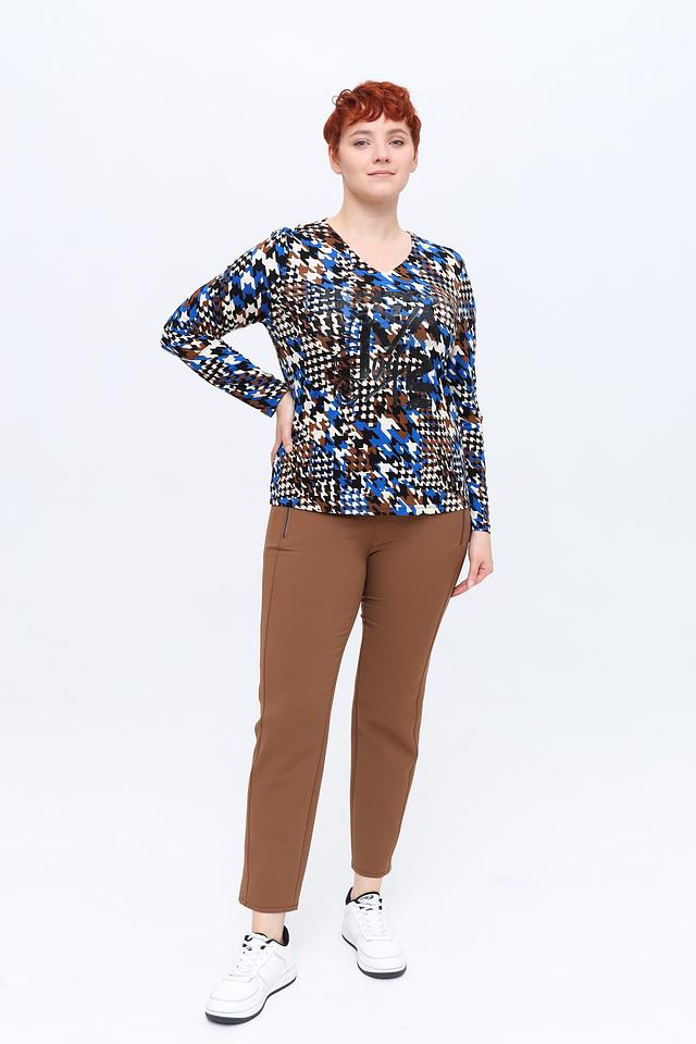 Лонгслив имеет оригинальный принт в сине-коричневой гамме, который придает образу динамичность и индивидуальность. V-образный вырез горловины и длинные рукава делают его универсальным для различных случаев.
