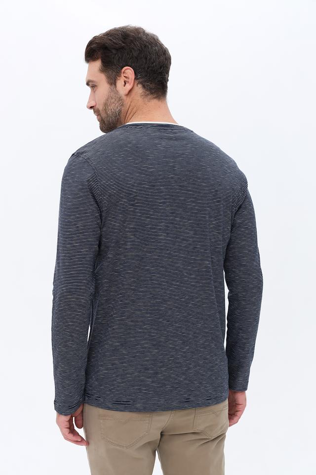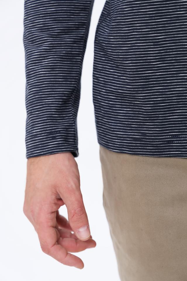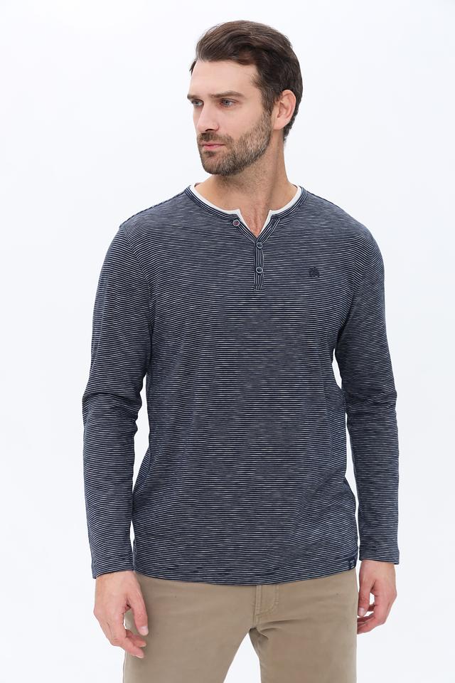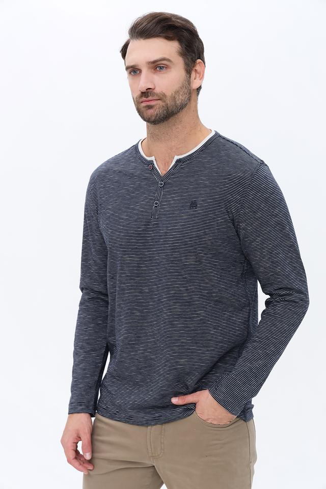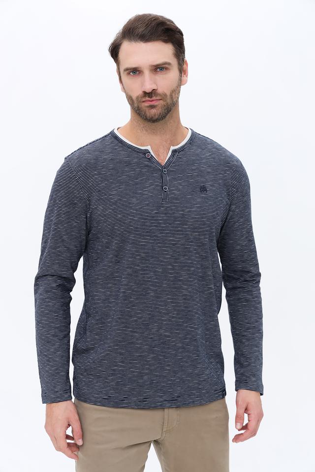 Мужской лонгслив Lerros синего цвета с полоской и воротником с планкой на пуговицах. Изготовлен из 100% хлопка, обеспечивающего комфорт и воздухопроницаемость. Отличный выбор для повседневного образа. Состав: хлопок 100%