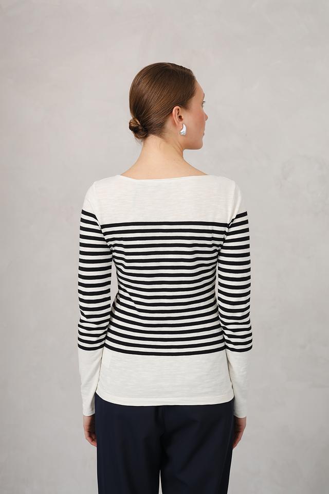 Классический крой и универсальная бело-чёрная полоска делают этот лонгслив подходящим для различных стилей и образов. Он легко сочетается с джинсами, брюками или юбками, создавая как повседневные, так и более элегантные комплекты.