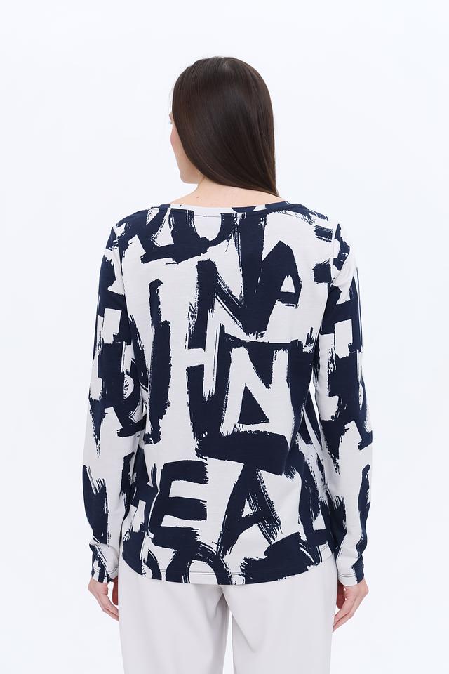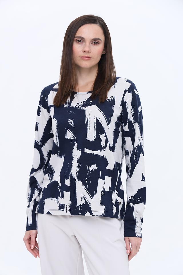 Женский лонгслив Monari синего цвета с оригинальным белым абстрактным принтом. Изготовлен из мягкого и приятного к телу сочетания хлопка и модала, обеспечивающего комфорт в носке. Стильный и универсальный выбор для создания повседневных образов. Состав: хлопок 50%, модал 50%