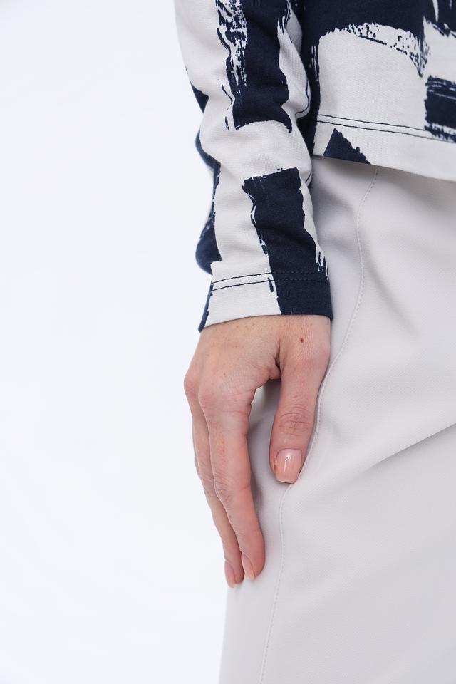 Лонгслив имеет прямой крой и длинные рукава, что делает его идеальным для прохладной погоды. Основной цвет изделия – глубокий синий, который эффектно контрастирует с белым абстрактным принтом, создавая яркий и запоминающийся образ.