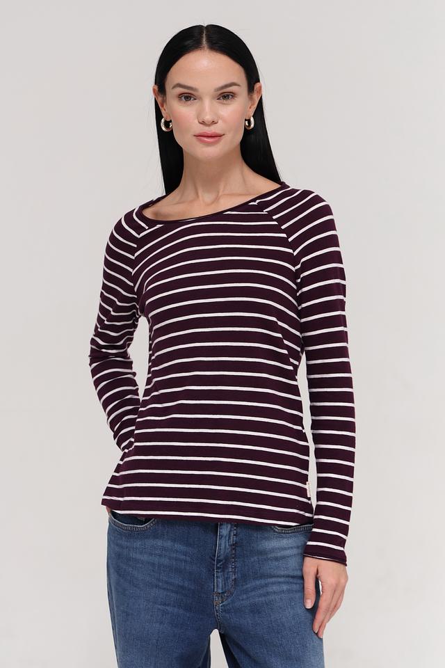Женский лонгслив Tom Tailor бордового цвета в классическую полоску. Изготовлен из 100% хлопка, обеспечивающего комфорт и воздухопроницаемость. Отличный выбор для создания повседневных образов. Состав: хлопок 100%