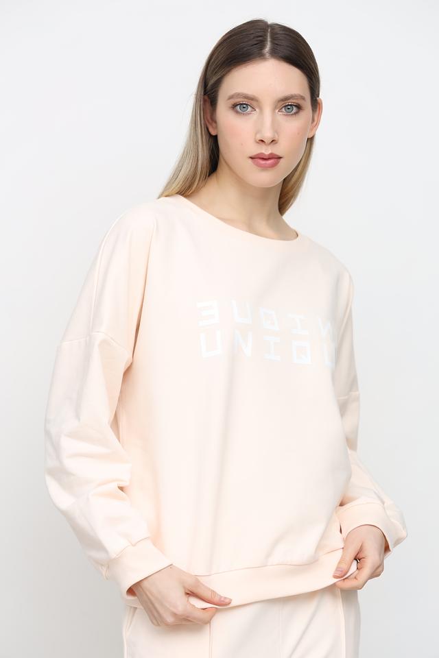 Лонгслив имеет свободный крой, круглый вырез горловины и длинные рукава. На передней части изделия расположен светлый принт с надписью "UNIQUE", который добавляет образу оригинальности.