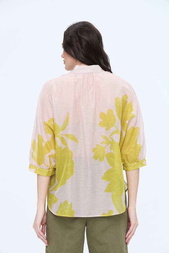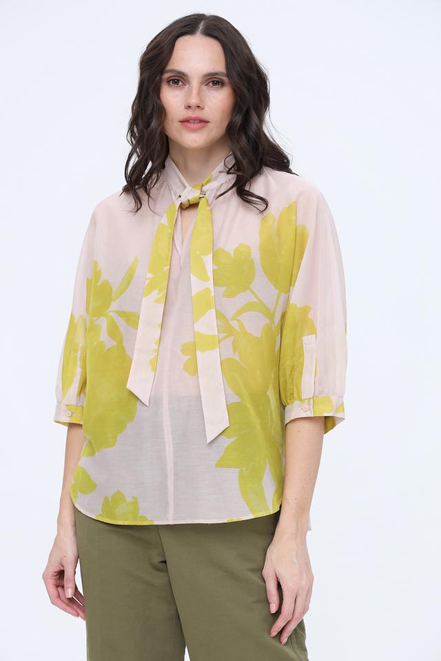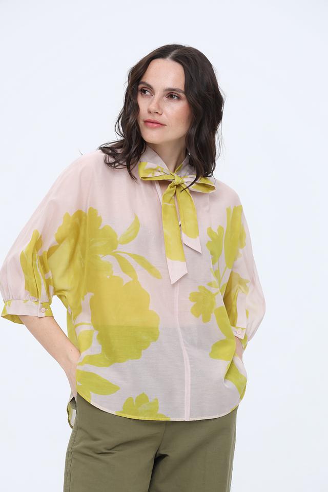 Блуза имеет свободный крой, который не сковывает движений и позволяет создать расслабленный образ. Преобладающий цвет – нежно-розовый, который служит идеальным фоном для яркого цветочного принта в оттенках жёлтого и зелёного.