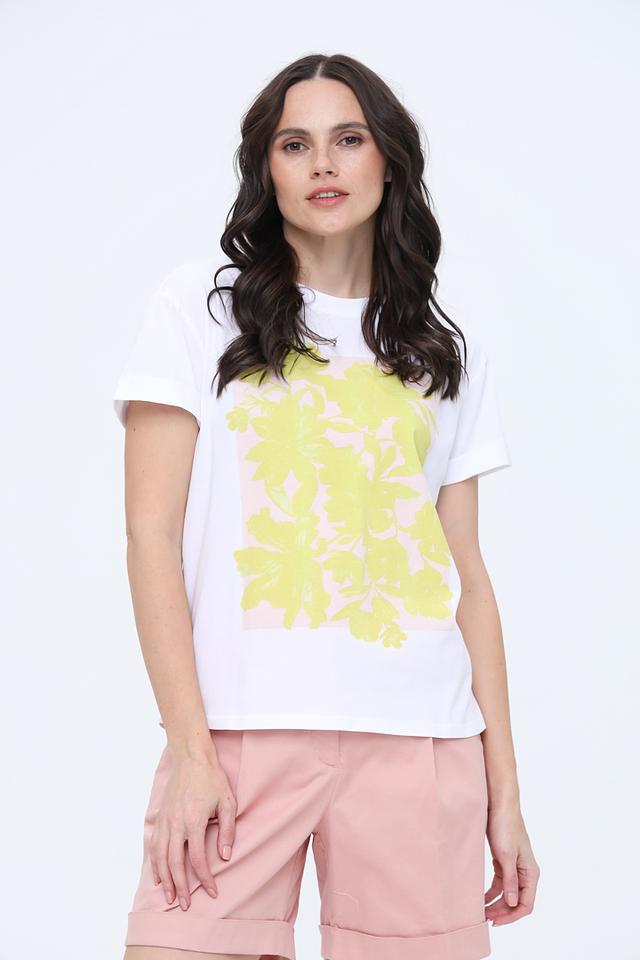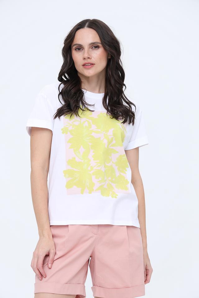Основной цвет футболки – белый, который служит идеальным фоном для яркого цветочного принта, выполненного в оттенках жёлтого и розового. Принт добавляет образу свежести и оригинальности.