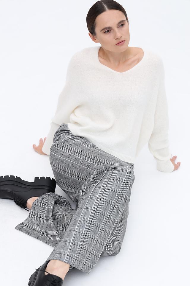 Пуловер имеет прямой крой и V-образный вырез, что делает его универсальным и подходящим для различных стилей. Молочный цвет придает изделию нежность и элегантность, позволяя легко сочетать его с другими элементами гардероба.