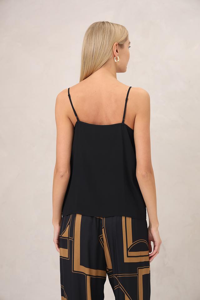 Чёрный топ от Luisa Cerano с тонкими бретелями и V-образным вырезом, украшенным деликатной вышивкой. Изготовлен из сочетания ацетата и шёлка, что обеспечивает комфорт и элегантный вид. Состав: ацетат 69%, шелк 31%