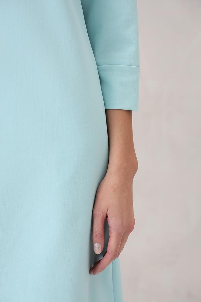 Платье имеет короткие рукава 3/4, что делает его подходящим для теплой погоды. Круглый вырез горловины придает образу женственность и элегантность. Скрытая молния в боковом шве обеспечивает удобство при надевании и снятии.