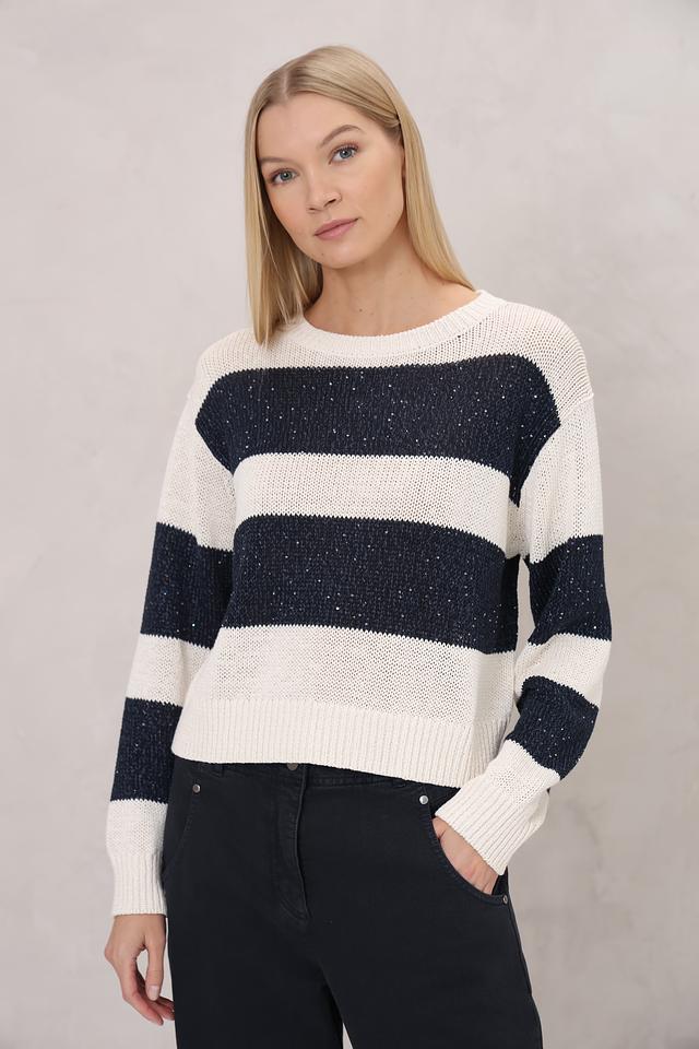 Этот пуловер от Luisa Cerano станет отличным дополнением к вашему гардеробу. Он выполнен в классическом стиле с горизонтальной полоской, сочетающей кремовый и тёмно-синий цвета.