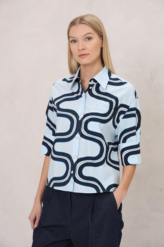 Женская рубашка Luisa Cerano голубого цвета с оригинальным волнистым принтом. Модель с коротким рукавом и классическим воротником станет стильным дополнением к вашему гардеробу. Состав: хлопок 100%