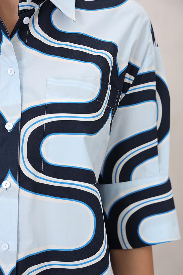 Рубашка имеет прямой крой, который хорошо сидит на фигуре, не сковывая движений. Классический воротник и короткие рукава придают ей непринужденный вид. Главная особенность этой модели – яркий волнистый принт в сочетании голубого и тёмно-синего цветов, который делает её по-настоящему уникальной.