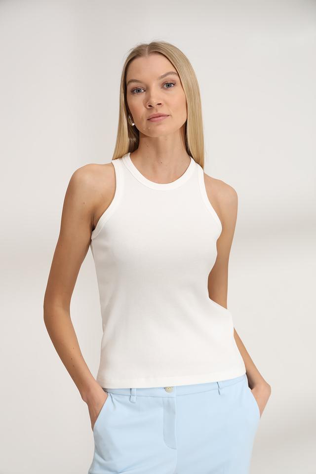 Топ имеет облегающий силуэт и круглый вырез горловины. Изготовлен из высококачественного хлопка с добавлением эластана, что обеспечивает комфорт и свободу движений. Ткань приятна на ощупь и хорошо держит форму.