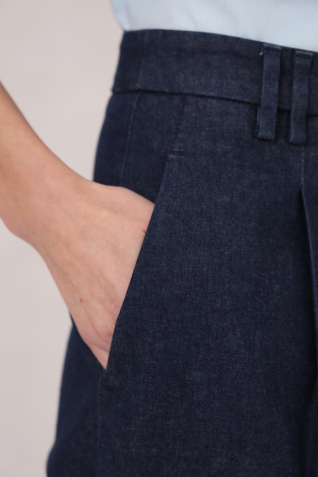 Брюки имеют прямой крой, высокую посадку и широкие штанины, что обеспечивает свободу движений и комфорт в течение всего дня. Передняя часть брюк оформлена защипами, придающими им более элегантный и утонченный вид. Застежка на молнию и пуговицу, а также наличие задних карманов с клапанами.