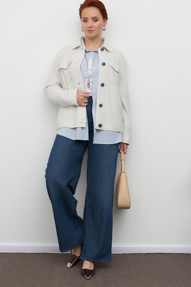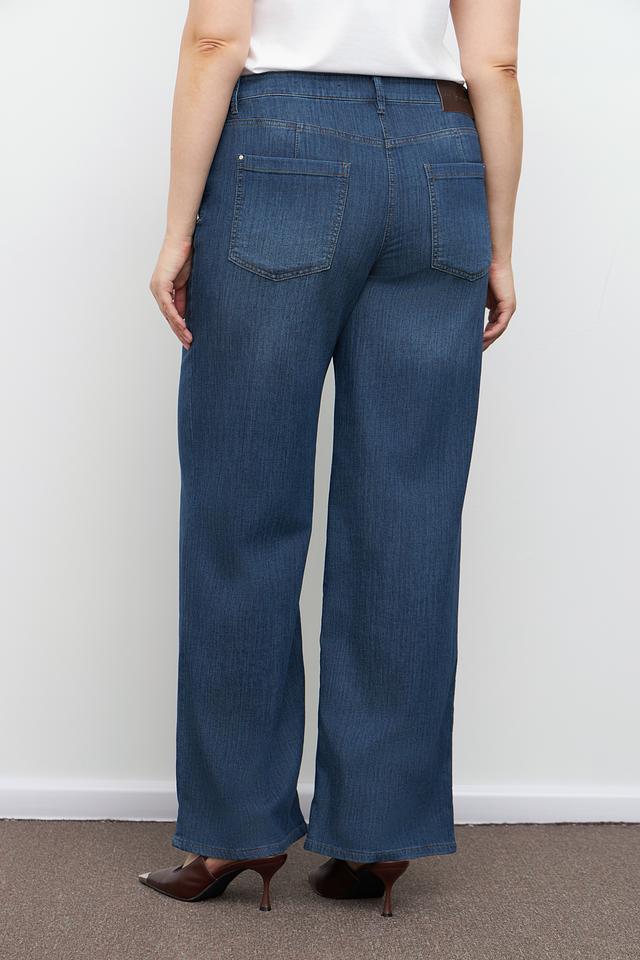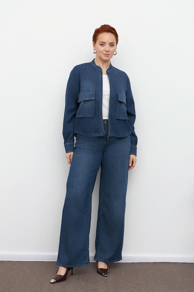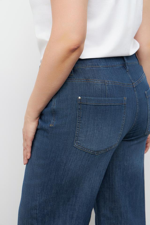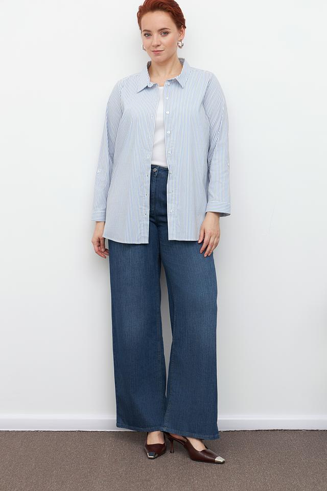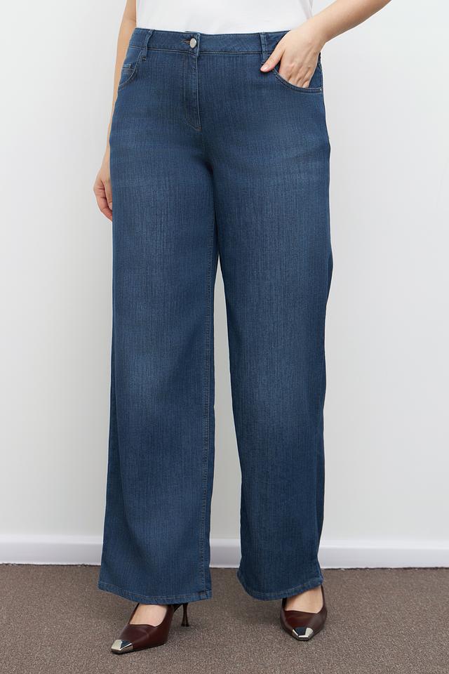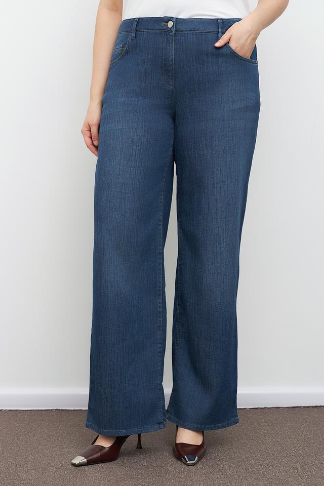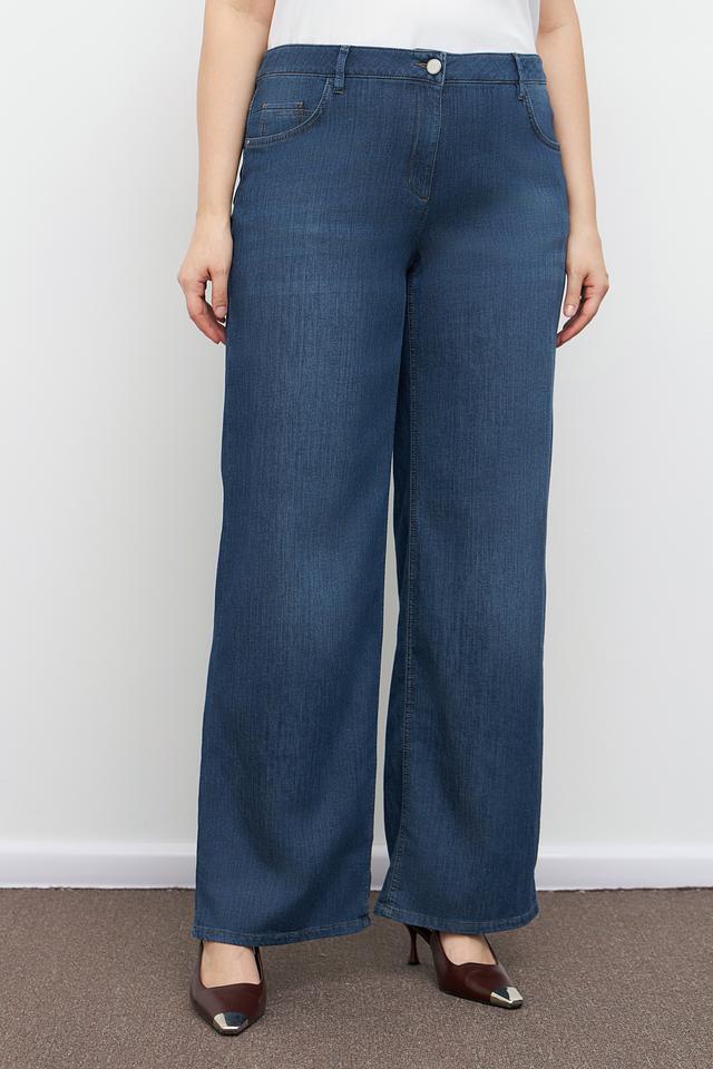 Брюки имеют классический синий цвет и прямой крой, расширяющийся к низу, создавая эффектный силуэт. Высокая посадка подчеркивает талию и визуально удлиняет ноги. Модель оснащена стандартными карманами спереди и сзади.
