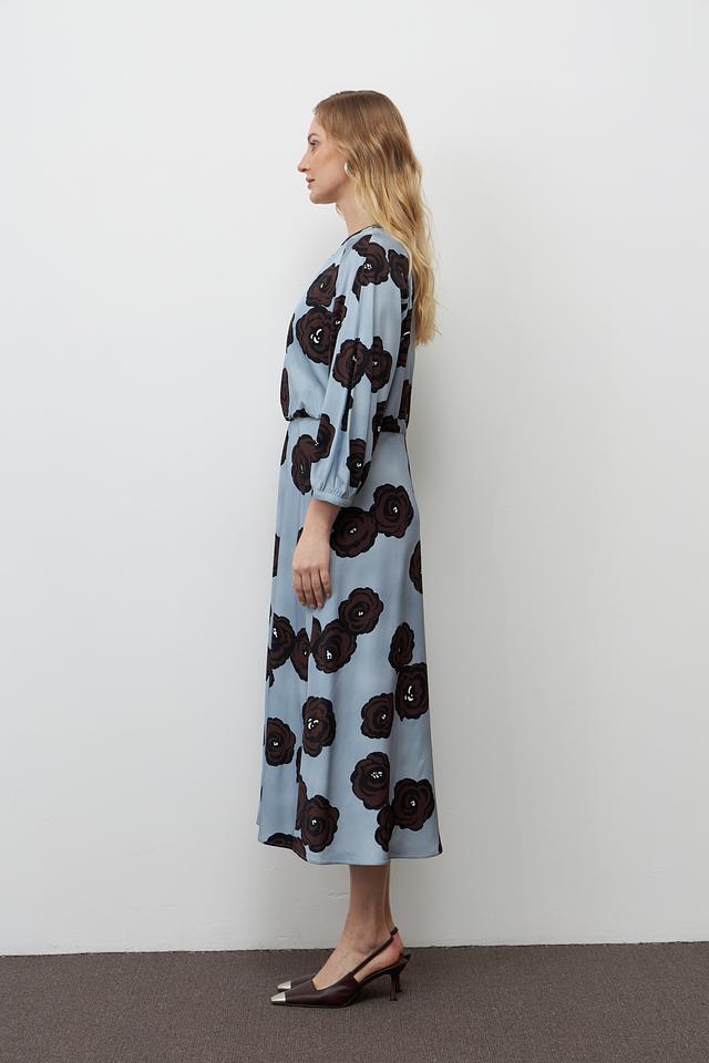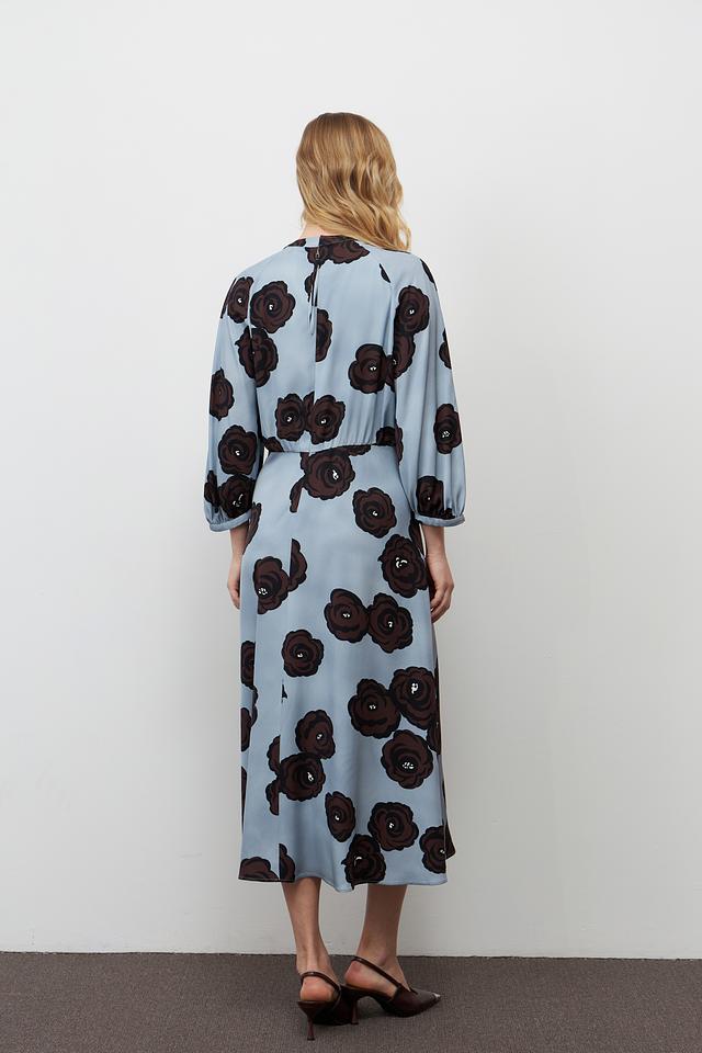 Модель имеет прямой силуэт, длину миди и рукава три четверти с небольшими складками у манжет. Вырез горловины округлый, с небольшим разрезом. Платье дополнено тонким поясом в тон ткани, который акцентирует внимание на талии и создает более женственный силуэт.