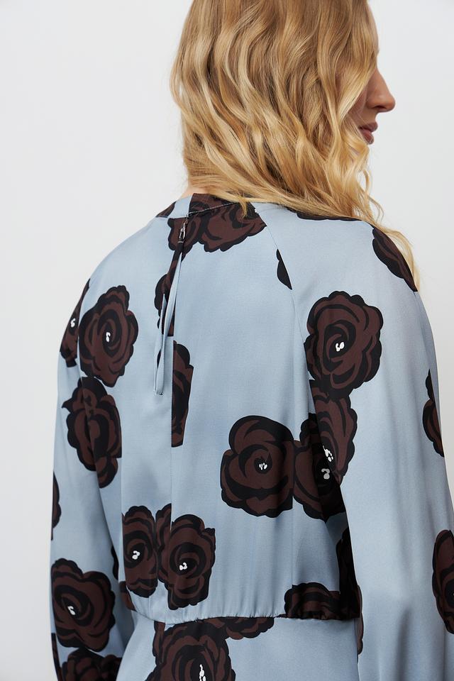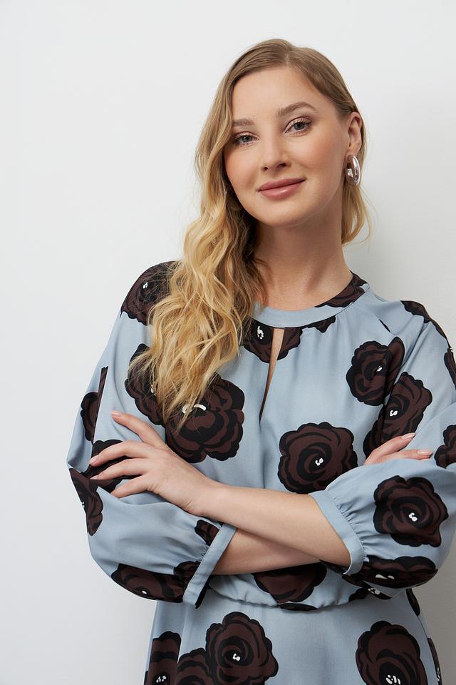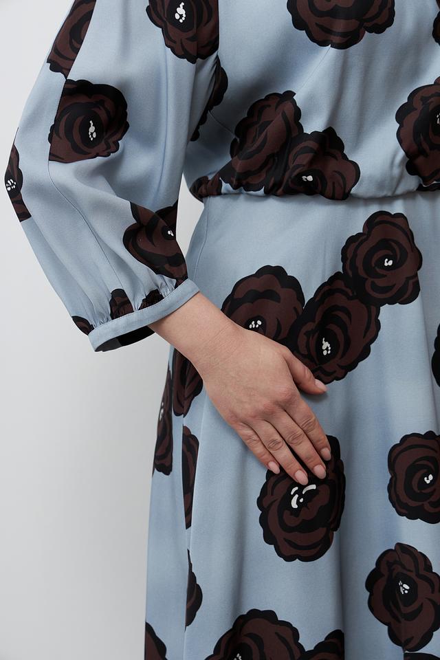Это стильное платье от бренда Luisa Cerano станет прекрасным дополнением вашего гардероба. Платье выполнено в нежном голубом цвете и украшено крупным цветочным принтом в виде тёмно-бордовых роз.