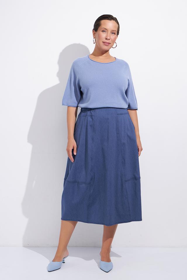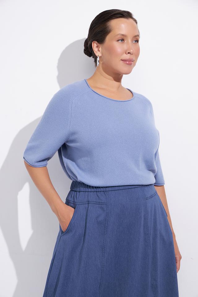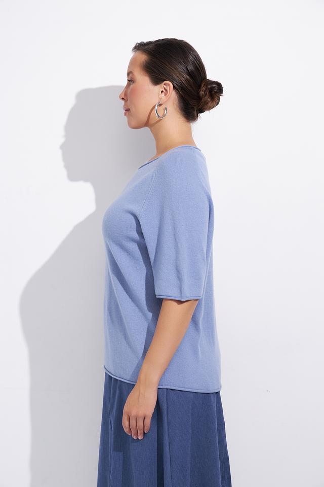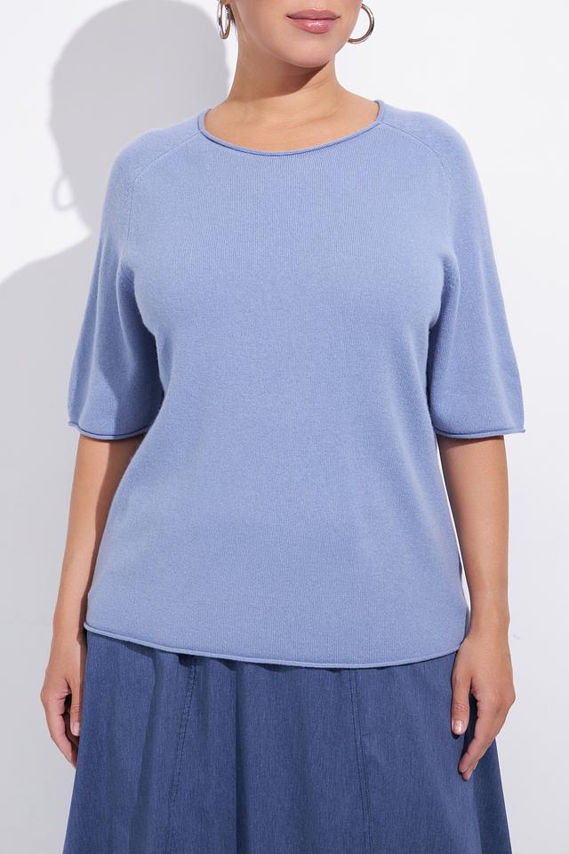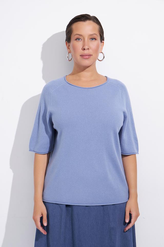 Пуловер имеет спокойный голубой цвет, который легко сочетается с различными элементами гардероба. Круглый вырез горловины и короткий рукав 3/4 придают модели женственность и лёгкость.