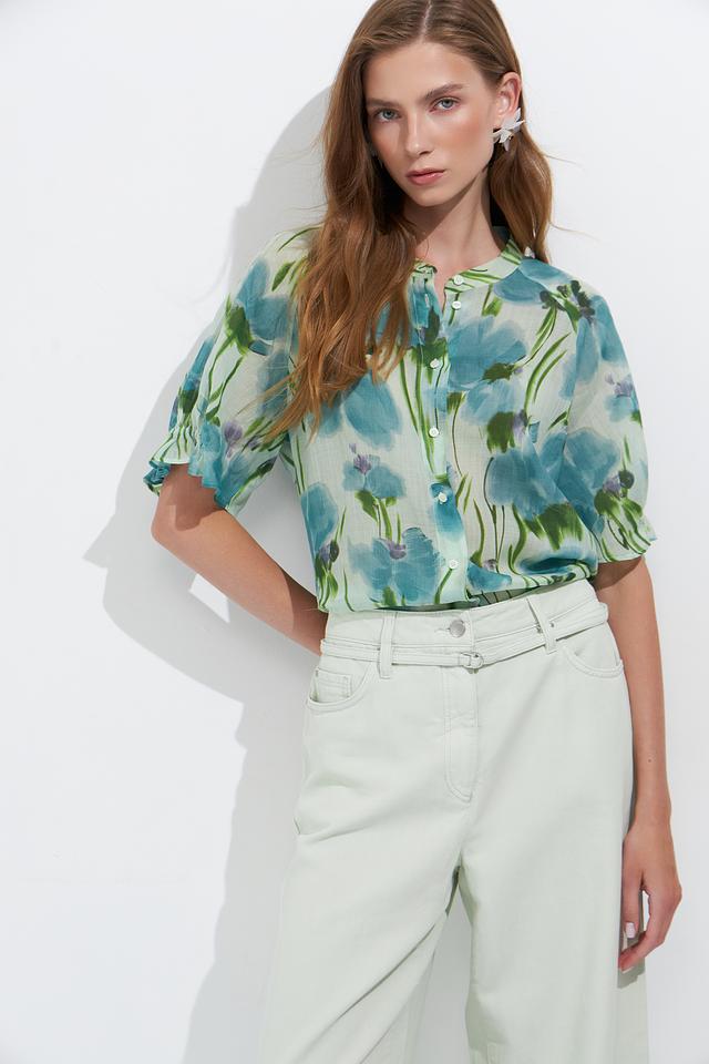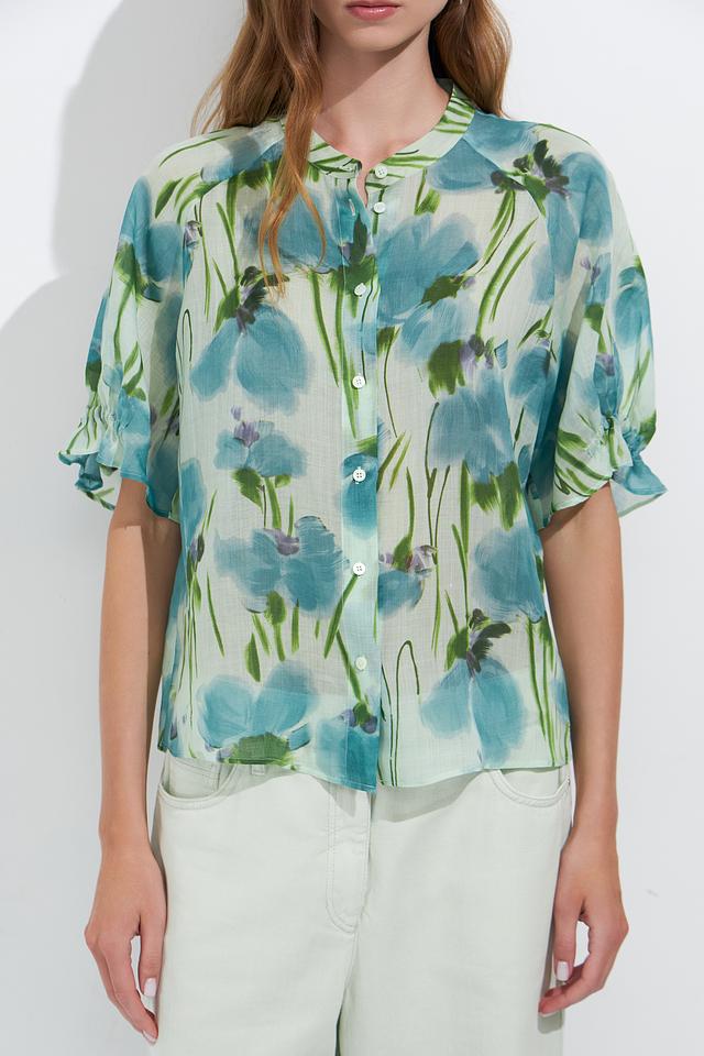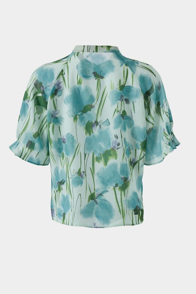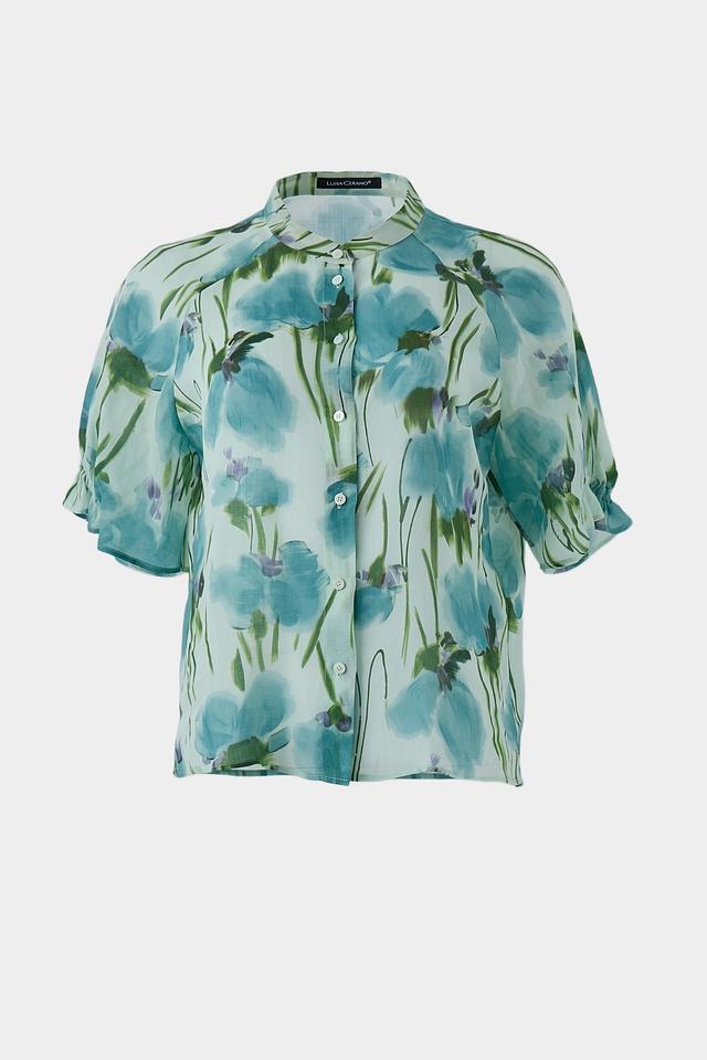 Блуза от Luisa Cerano светло-голубого цвета с ярким цветочным принтом. Модель выполнена из лёгкой ткани с короткими рукавами и V-образным вырезом, застёжка на пуговицы. Состав: луоселл 52%, рами 48%