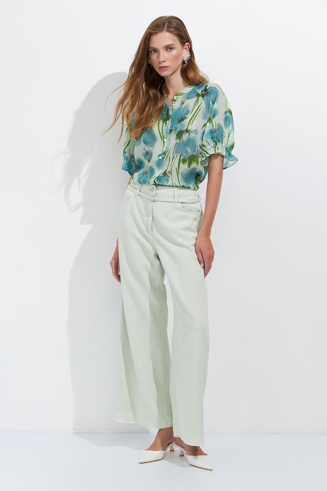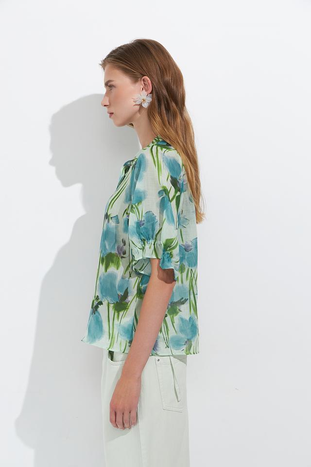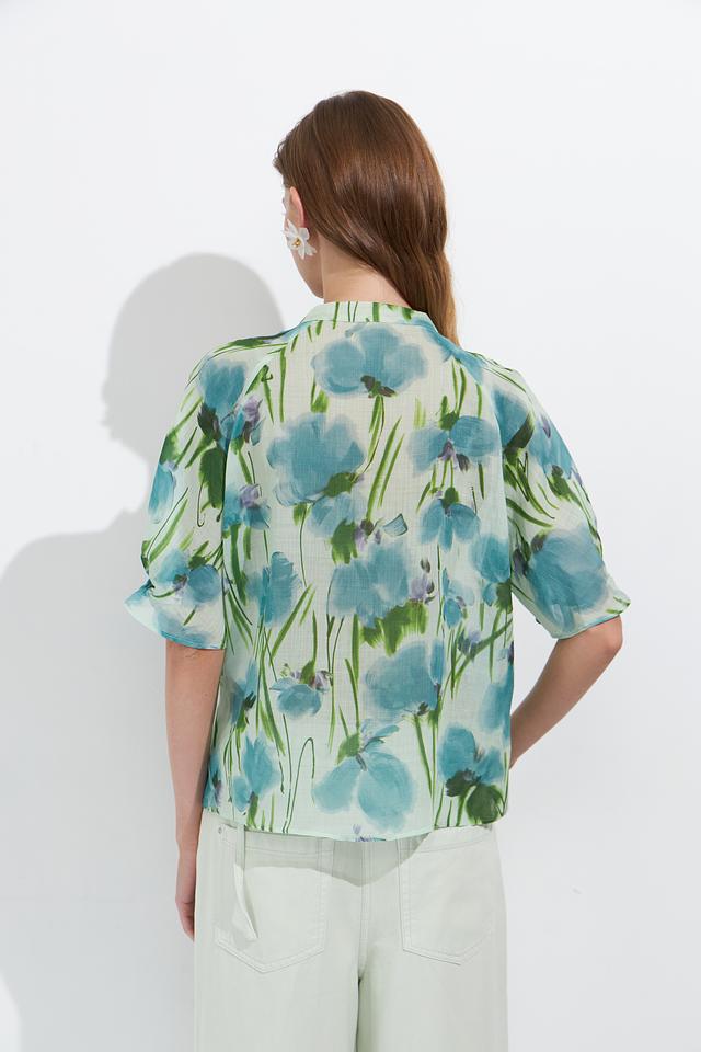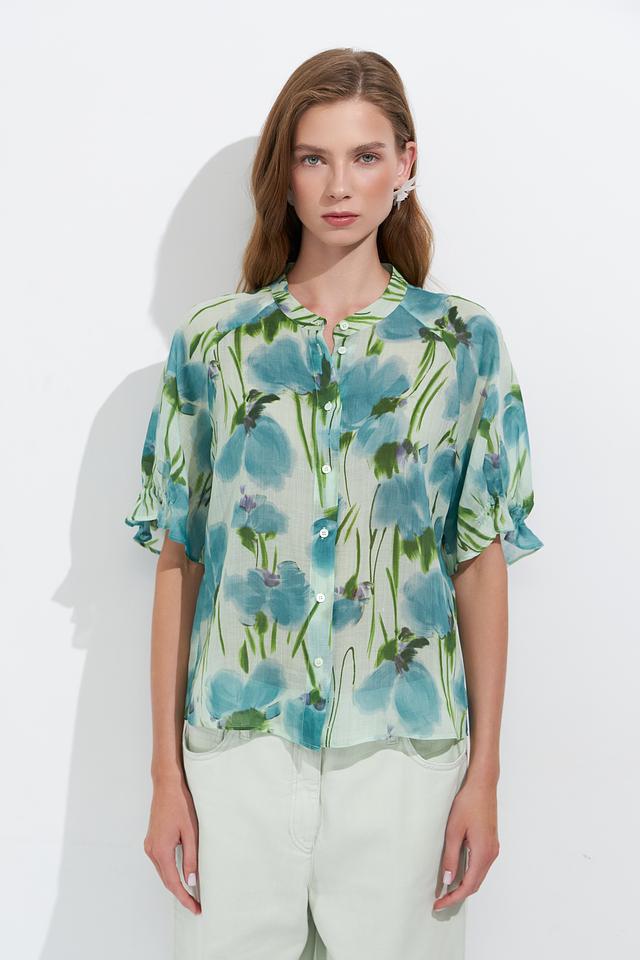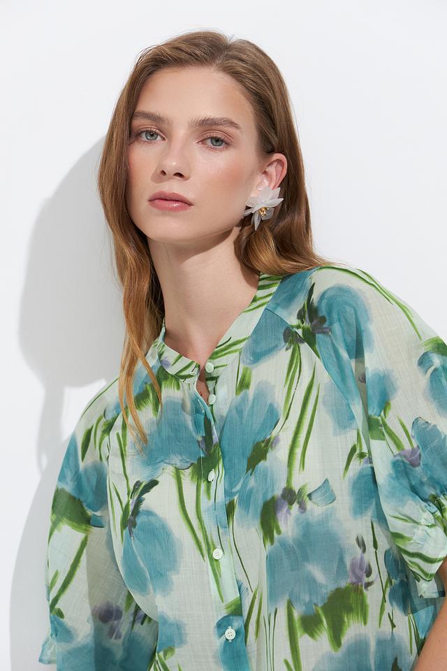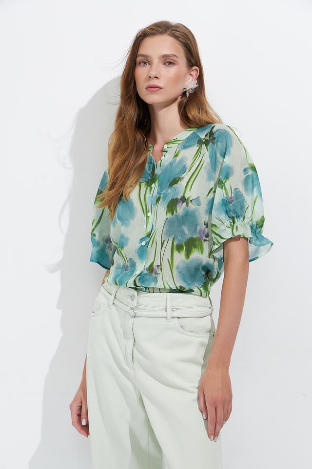 Блуза имеет светло-голубую основу, украшенную ярким и красочным цветочным принтом, создающим свежий и романтичный образ. V-образный вырез и короткие рукава делают её идеальной для тёплой погоды.