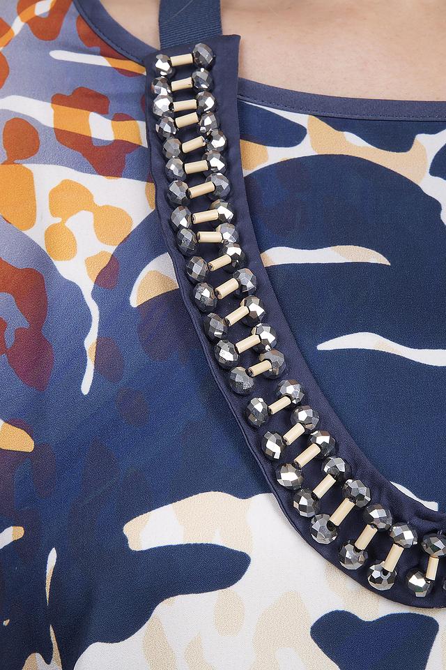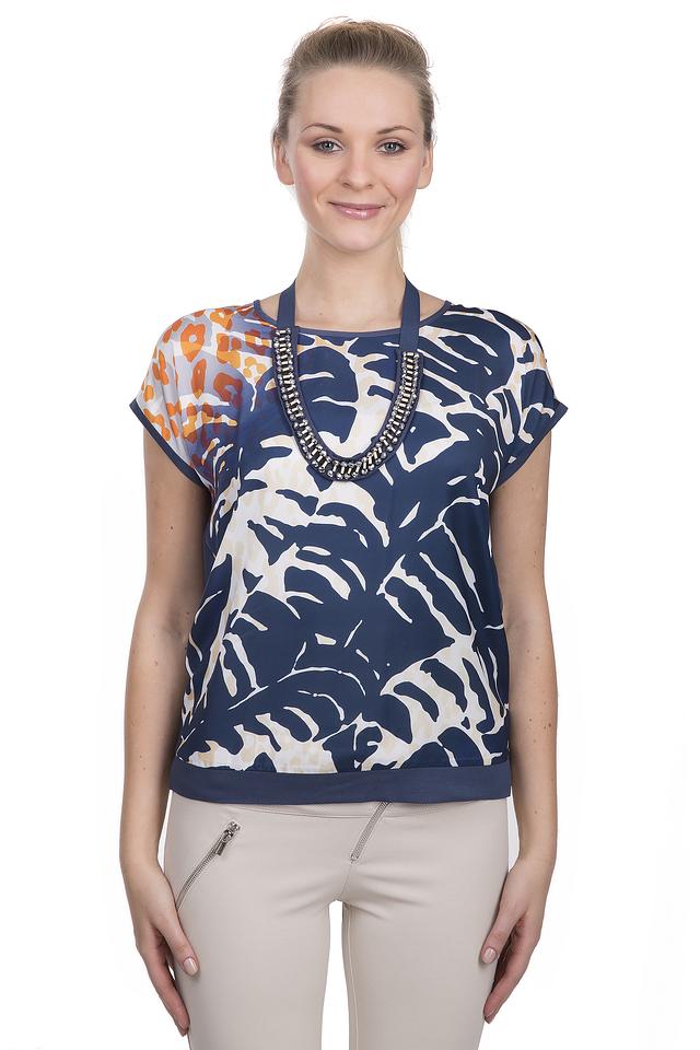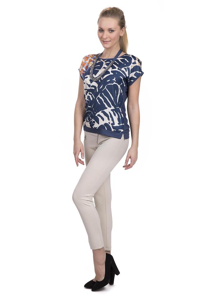Блуза имеет прямой крой, короткие рукава и округлый вырез горловины. Главная особенность модели – эффектный цветочный принт, сочетающий в себе оттенки синего, белого, оранжевого и коричневого. Принт расположен на передней части блузы и на рукавах, создавая динамичный и запоминающийся образ.