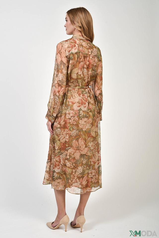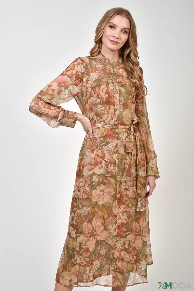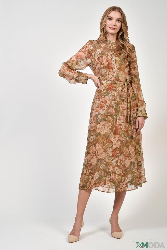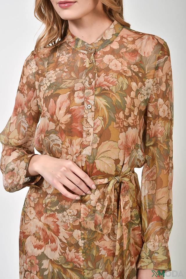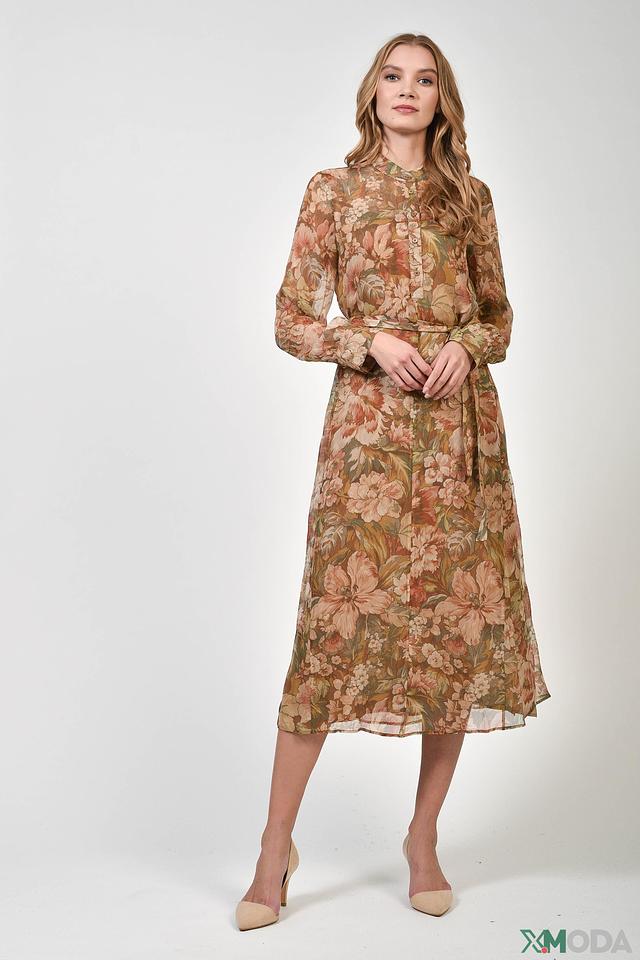 Особенностью этого платья является его цветочный принт, выполненный в коричневых, оранжевых и зеленых тонах. Подкладка выполнена из 100% вискозы, что обеспечивает дополнительный комфорт при носке.