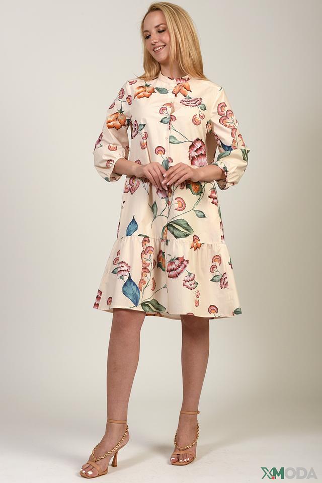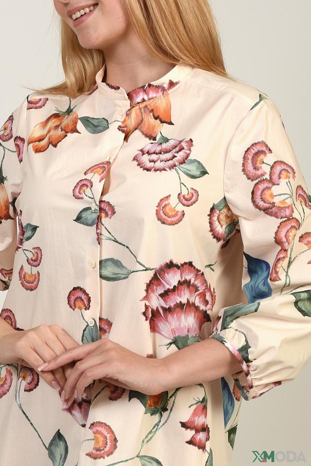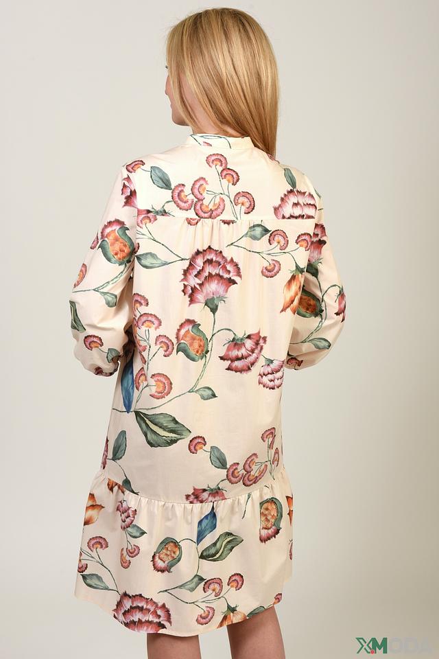 Платье имеет лёгкий, слегка приталенный силуэт, который подчеркивает фигуру. Особенностью модели является яркий цветочный принт, который добавляет образу свежести и женственности. Воротник-стойка и длинные рукава с манжетами придают платью элегантность.