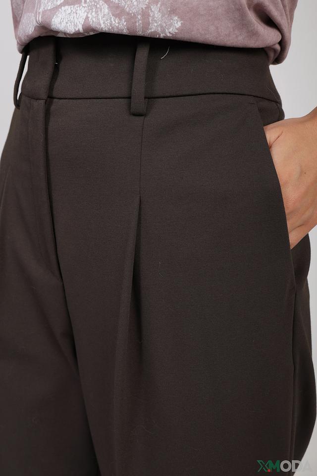 Брюки имеют прямой крой и завышенную талию, что обеспечивает комфортную посадку и подчеркивает достоинства фигуры. Наличие складок придает брюкам элегантный и утонченный вид.