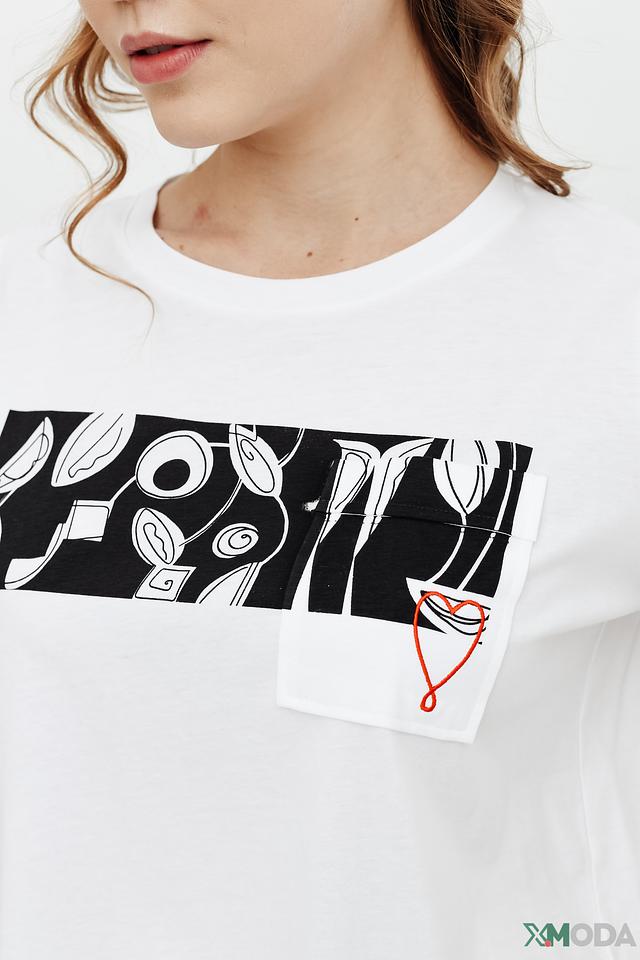 Особенностью данной модели является яркий и запоминающийся принт на передней части, выполненный в контрастных чёрно-белых тонах. Принт добавляет образу оригинальности и индивидуальности. Футболка имеет классический прямой крой, который подходит для любой фигуры.
