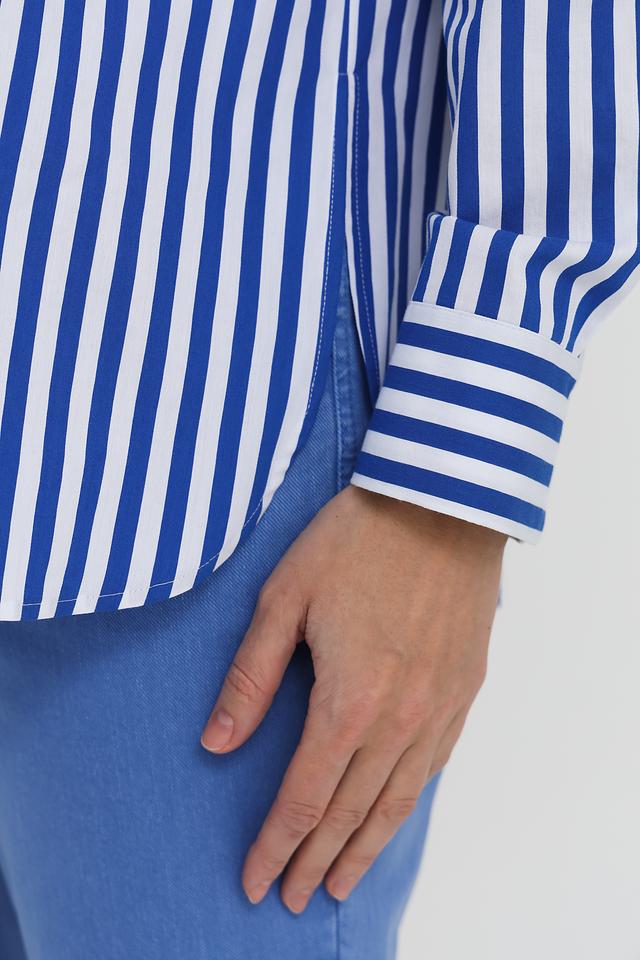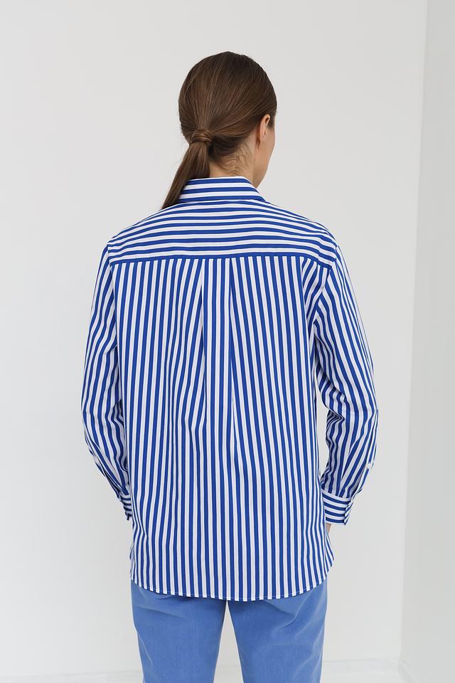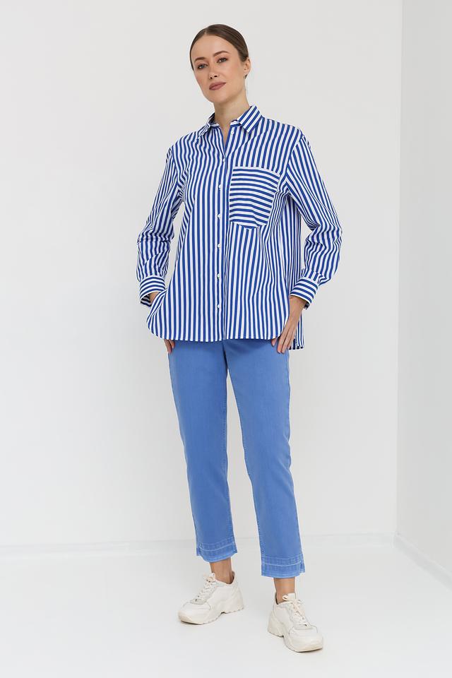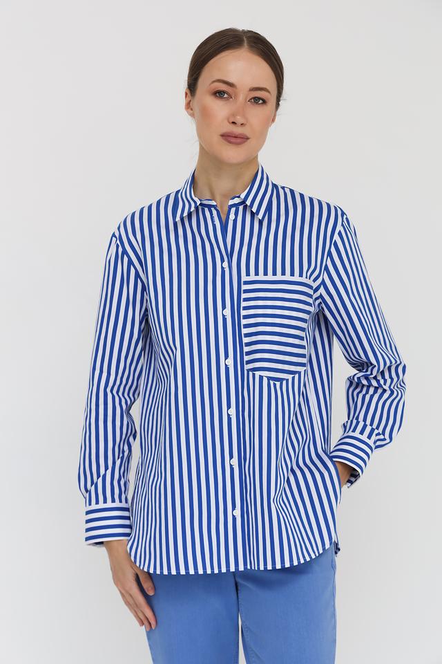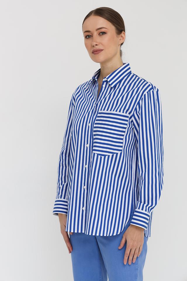 Рубашка имеет классический крой с длинными рукавами и отложным воротником. Ее отличает яркий дизайн в бело-синюю полоску, который добавит свежести и динамики вашему образу. На груди расположена накладная кармашка, которая придает рубашке более непринужденный вид.
