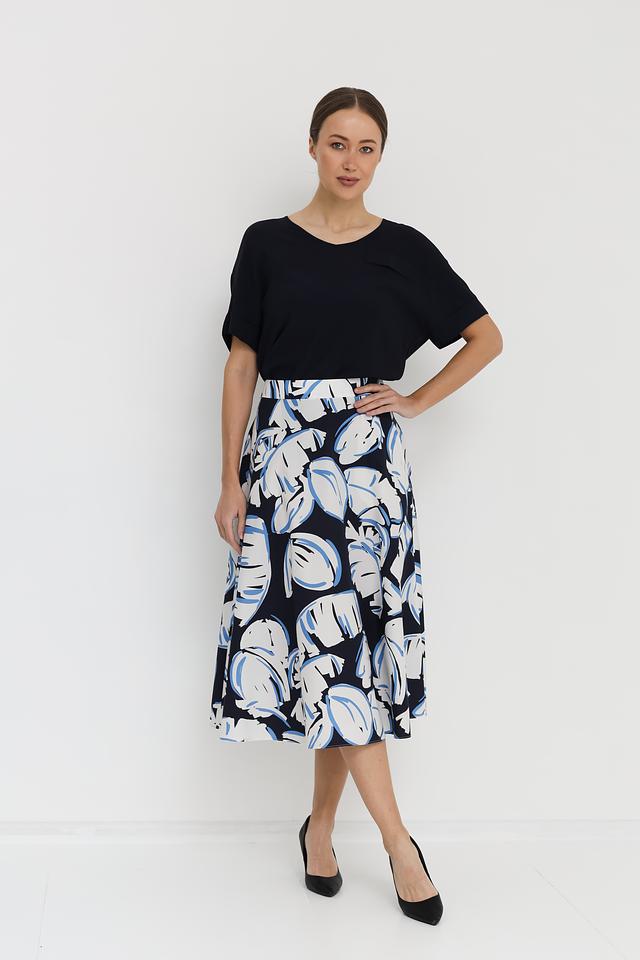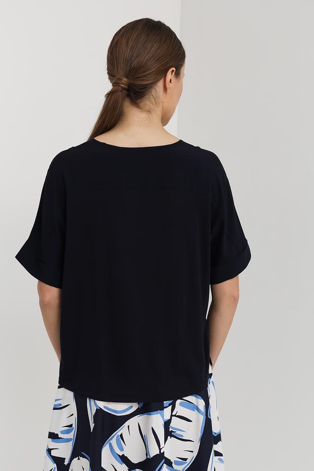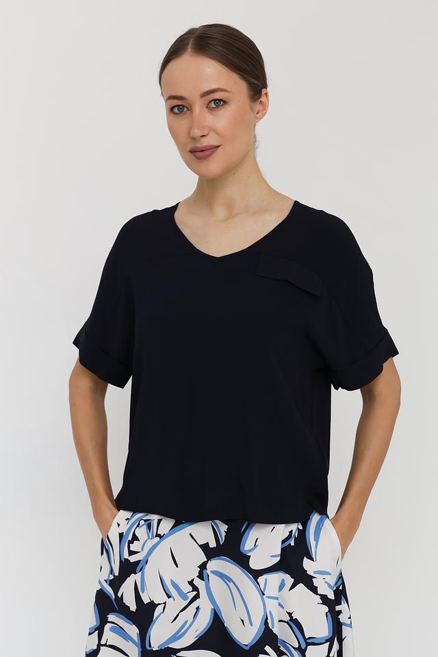 Блуза имеет прямой крой, который обеспечивает свободу движений и комфортную посадку по фигуре. V-образный вырез горловины визуально удлиняет шею и делает образ более изящным. Короткие рукава с манжетами добавляют блузе аккуратности и завершенности.