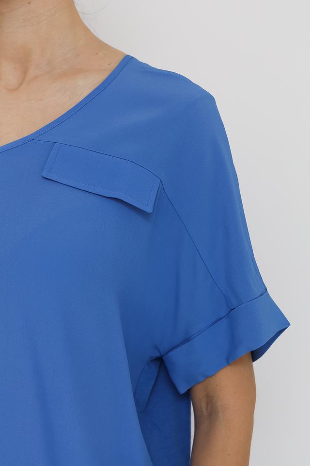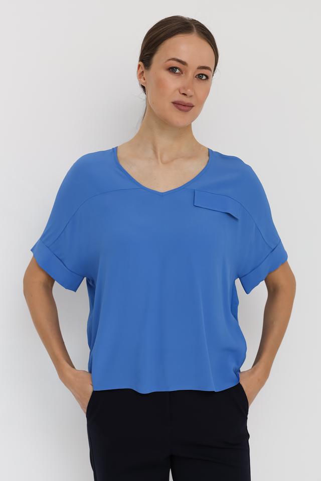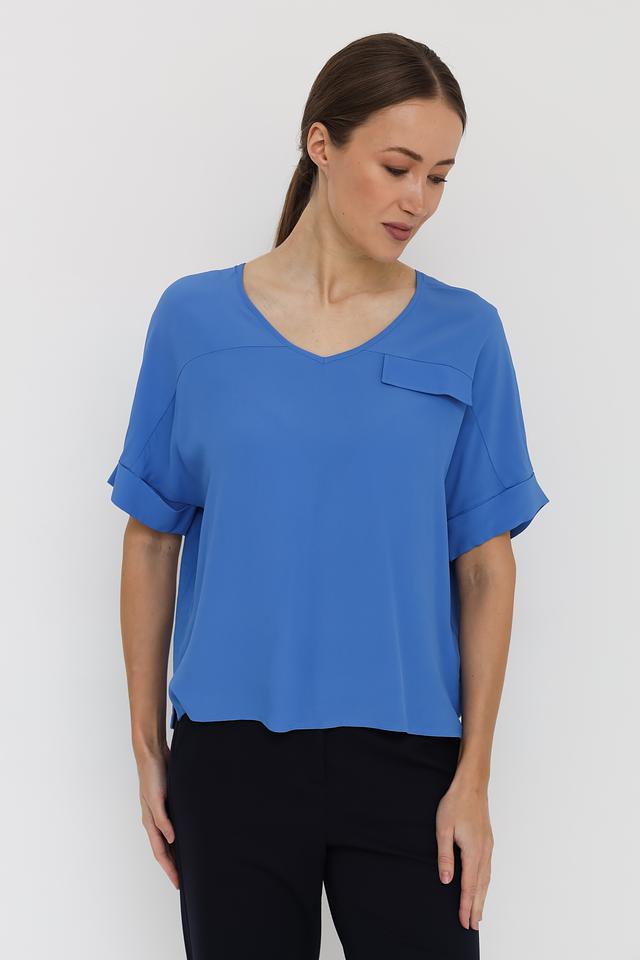 Блуза имеет V-образный вырез, который визуально удлиняет шею и подчеркивает линию декольте. Короткие рукава с манжетами добавляют образу изысканности. На груди расположился накладной карман, который придает блузе оригинальность.