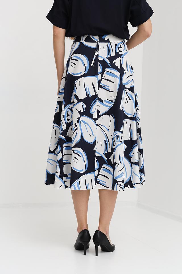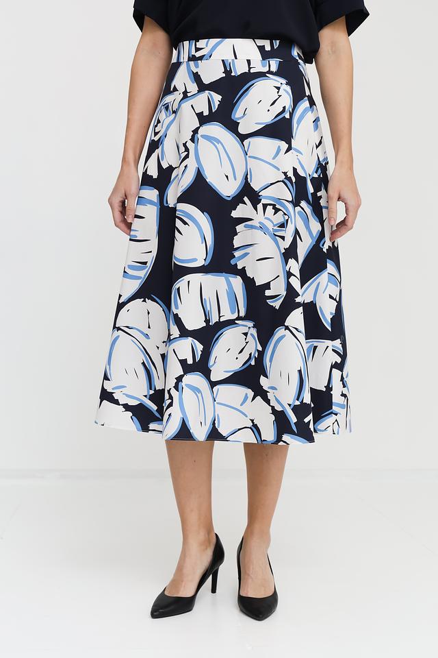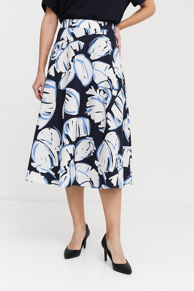 Принт выполнен в бело-голубых тонах и изображает крупные листья и цветы, создавая эффектный и запоминающийся образ. Юбка выполнена из 100% хлопка, что обеспечивает комфорт и воздухопроницаемость в жаркую погоду. Ткань приятна на ощупь и не требует особого ухода.