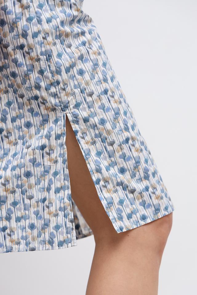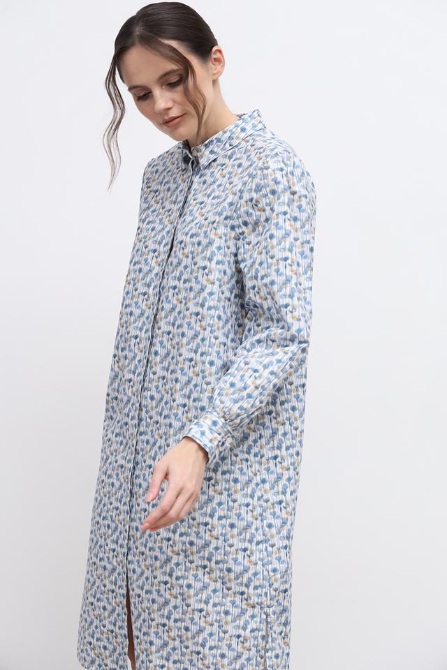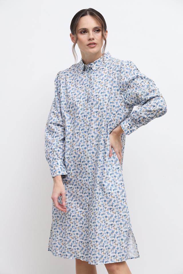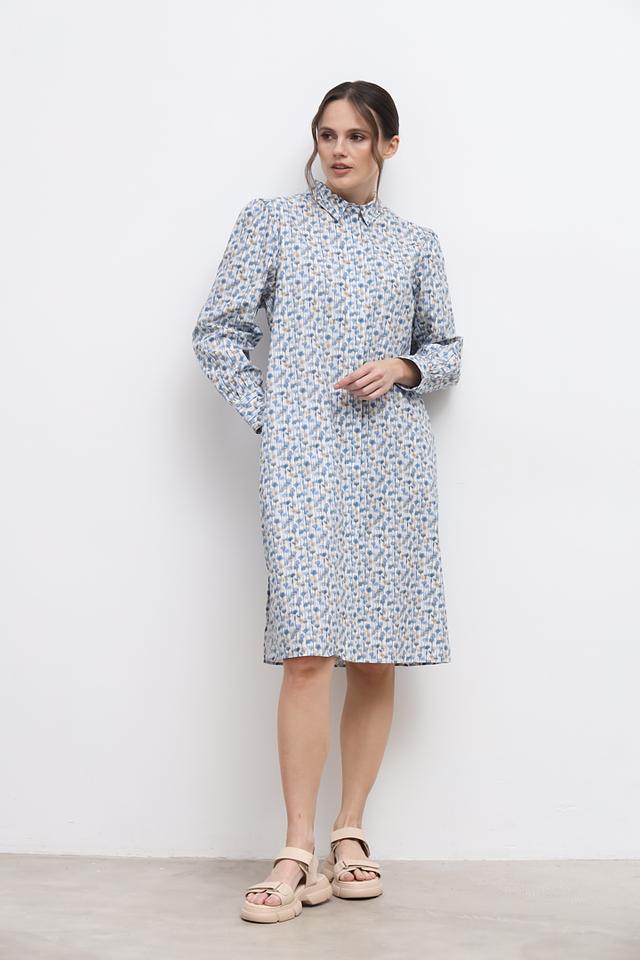 Основной цвет платья – голубой, украшен оно мелким цветочным принтом, выполненным в бежевых и коричневых тонах. Силуэт платья свободный, слегка приталенный, что обеспечивает свободу движений и комфортную посадку по фигуре. Модель имеет рубашечный крой с воротником и застёжкой на пуговицы по всей длине.