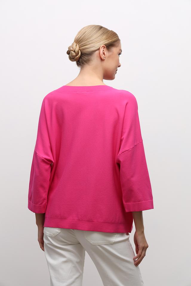 Пуловер имеет короткий рукав 3/4, что делает его подходящим для теплой погоды или для создания многослойных образов. Круглый вырез горловины добавляет модели универсальности.
