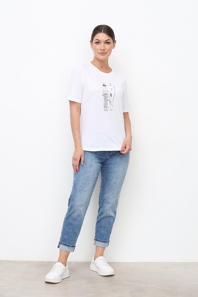Футболка имеет прямой крой и короткие рукава, что делает ее универсальной для различных образов. Главная особенность этой модели — стильный принт с изображением художницы за мольбертом, выполненный в графичной манере.